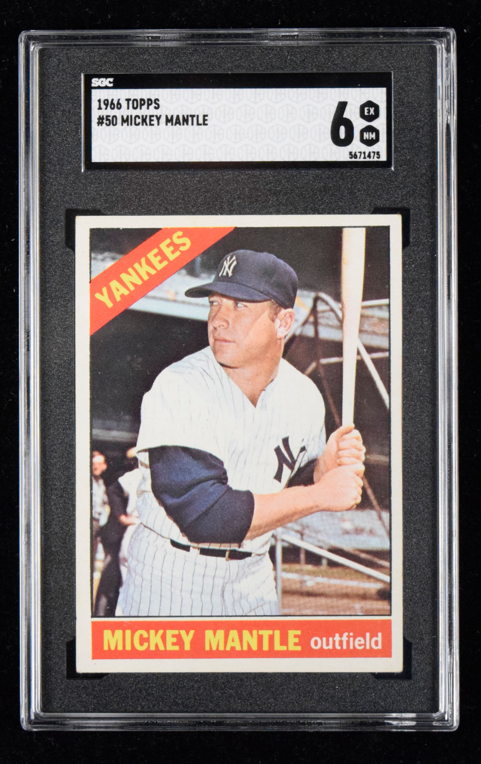 Description:1966 Topps #50 Mickey Mantle (SGC 6 EX/MT). Outstanding card exhibits near-perfect centering on the front and back, with a clean surface and minor wear on all four corners. Back is clean: SGC 6 EX/MT.