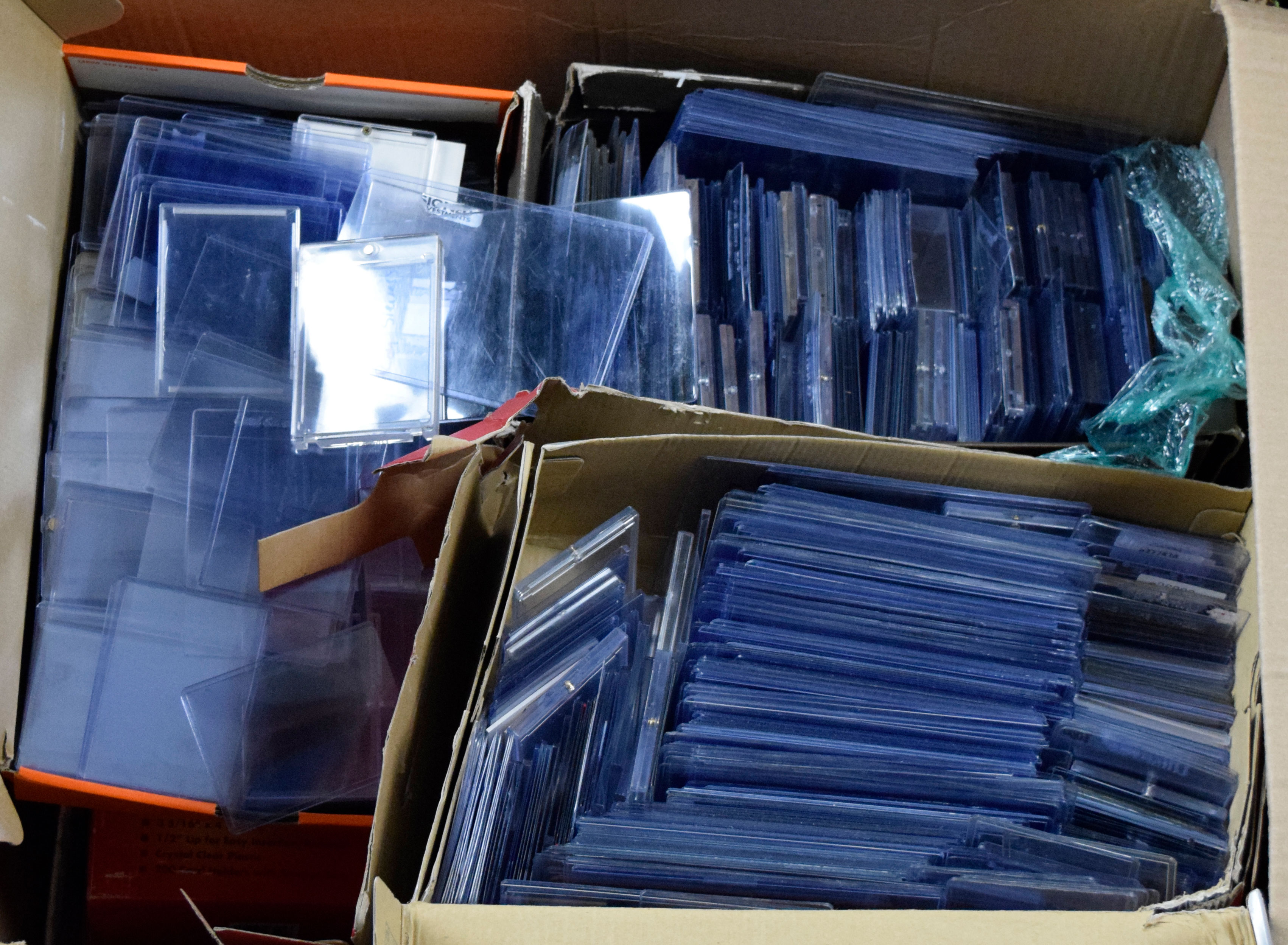 Description:Very large box with thousands of used card holders and supplies, including top loaders, Card Savers & screwdowns (EX). Immensely useful lot for collectors and dealers alike features a box measuring approx. 24"x21x19 that is chock full of lightly to moderately used (and empty) card holders and supplies. Included are standard size and supersize top loaders and Card Savers and screwdown holders, along with a few small-count plastic storage boxes. Most holders appear clean overall, though some do have writing, stickers or residue: EX.