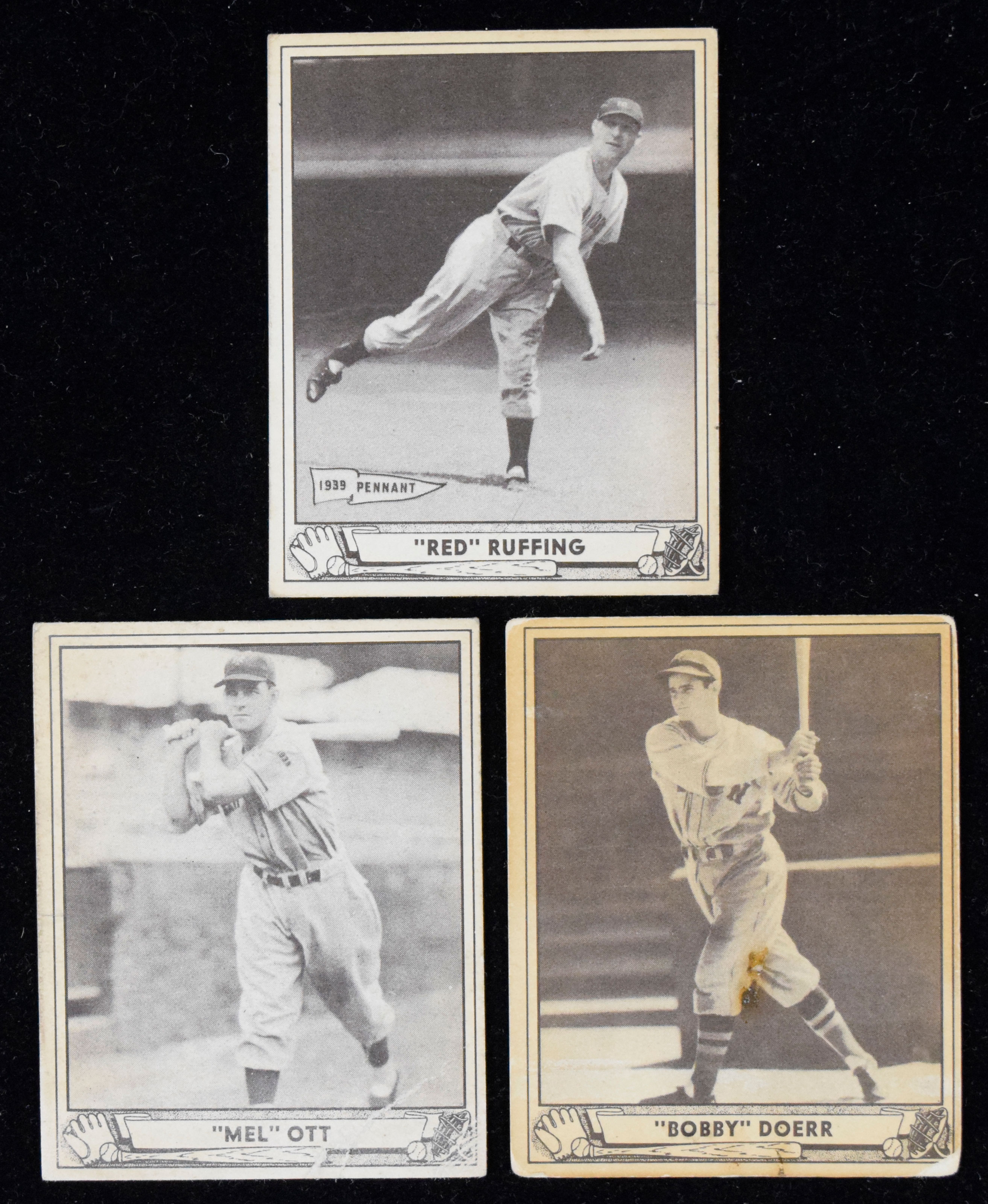 Description:Lot of (3) 1940 Play Ball HOFers, including Bobby Doerr, Mel Ott and Red Ruffing (PR-VG). Nice eye-appeal lot key HOFers from the 1940 Play Ball set, with #10 Red Ruffing (VG), #38 Bobby Doerr (FR) and #88 Mel Ott (PR). Range: PR-VG.