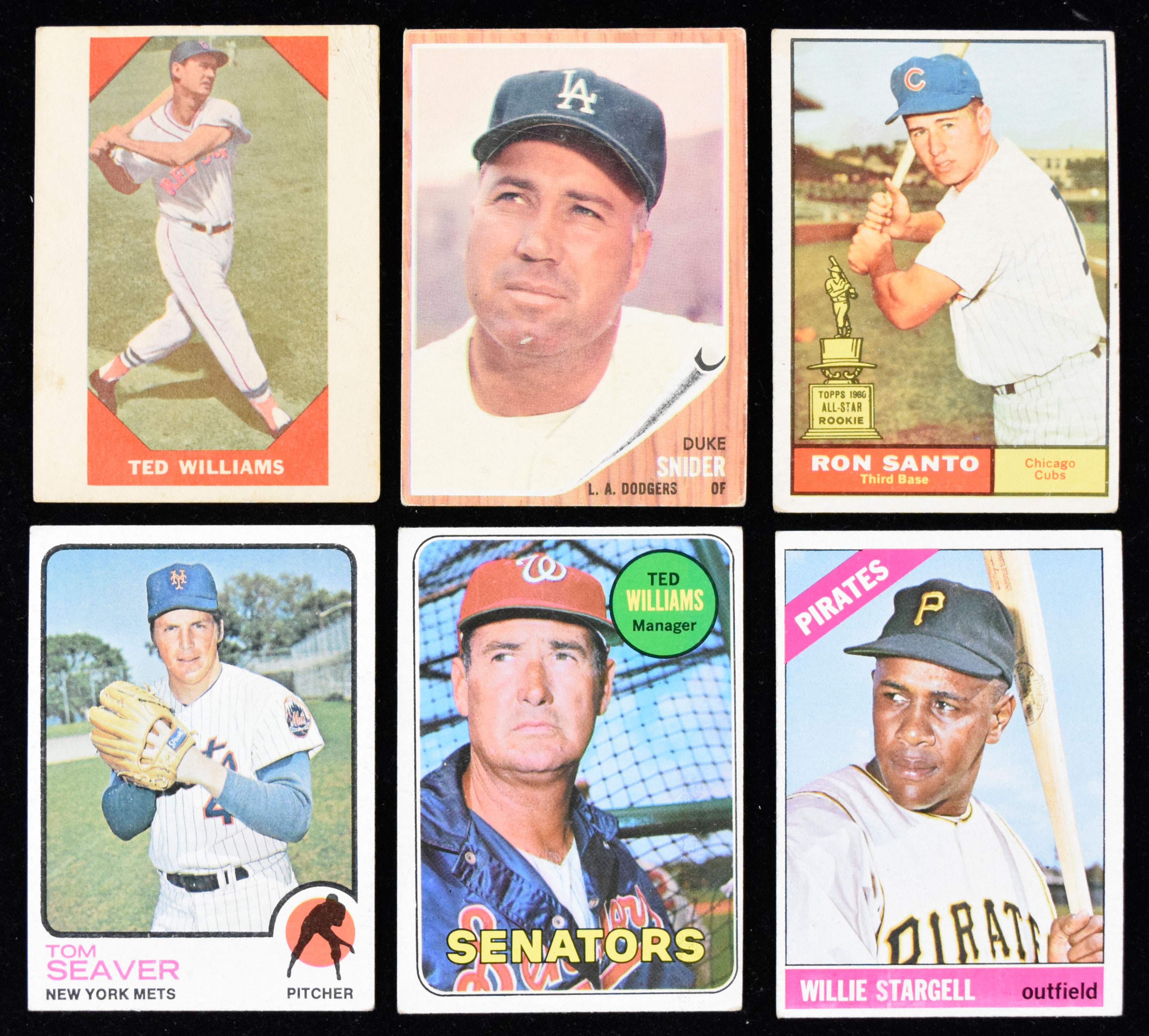 Description:Lot of (14) 1960-1974 Topps and Fleer stars and HOFers, including Ted Williams and Duke Snider (PR-VG/EX). Good assortment of vintage stars and HOFers, with 1960 Fleer #72 Ted Williams; 1961 Topps #443 Duke Snider and #35 Ron Santo RC; 1962 Topps #500 Duke Snider; 1966 Topps #s 255 Willie Stargell, 99 Buc Belters w/ Willie Stargell, #290 Ron Santo and (2) #91 Bob Uecker; 1969 Topps #s 570 Ron Santo and #650 Ted Williams; 1972 Topps #447 Willie Stargell IA; 1973 Topps #350 Tom Seaver and 1974 Topps #100 Willie Stargell. Most cards appear GD-VG. Range: PR-VG/EX.