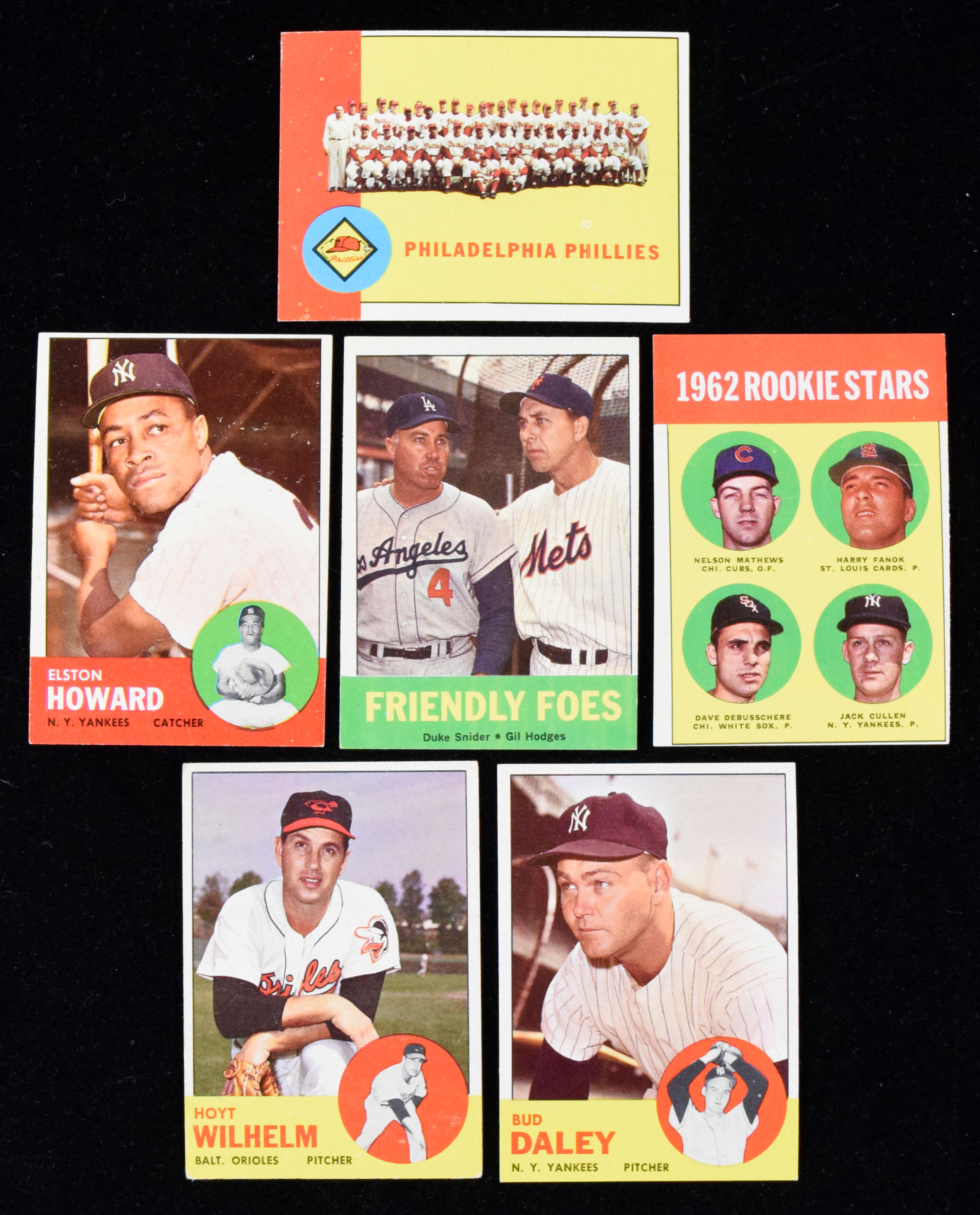 Description:Lot of approx. (175) 1963 Topps cards with commons and minor stars, including Duke Snider and Hoyt Wilhelm (GD-NM). Clean lot includes low numbers from the first series with moderate to heavy duplication, with mostly commons and minor stars. Highlights include #68 Friendly Foes with Duke Snider/Gil Hodges, (3) #13 Philadelphia Phillies team cards, #108 Hoyt Wilhelm, #353 Billy Williams, (2) #60 Elston Howard, #54 Dave DeBusschere RC and more. Most cards appear VG/EX-EX with some in higher grades with sharp corners. Range: GD-NM, including one marked checklist.