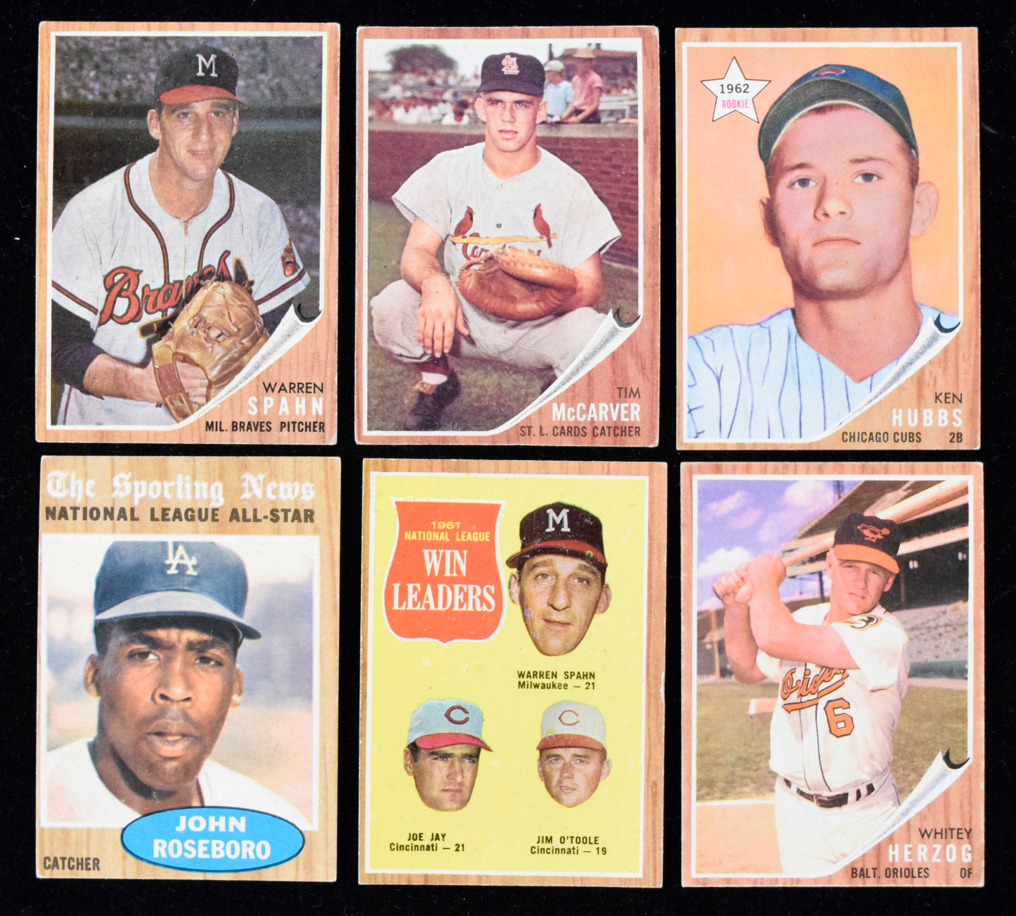 Description:Lot of (100+) 1962 Topps cards with stars, including Warren Spahn and Tim McCarver RC (GD-EX/MT). Useful lot for set building spans card numbers 4-535 with no duplication and mostly commons, minor stars and some stars, including #58 Warren Spahn LDR, #100 Warren Spahn, #167 Tim McCarver RC and more. Most cards appear VG/EX-EX. Range: GD-EX/MT.
