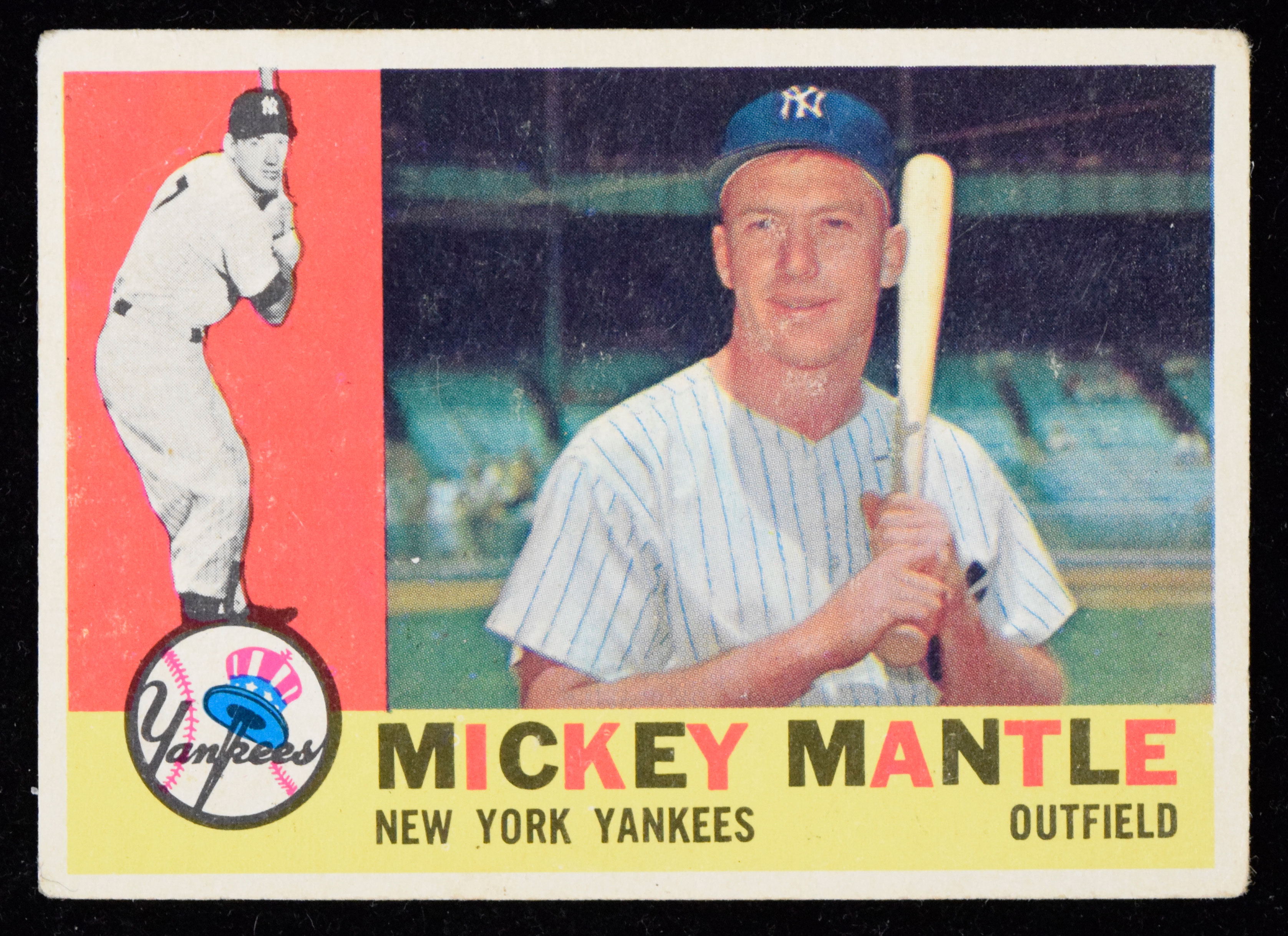 Description:1960 Topps #250 Mickey Mantle (FR). Card is nicely centered with moderate corner wear and a heavy crease in the upper left corner. Back is clean: FR.