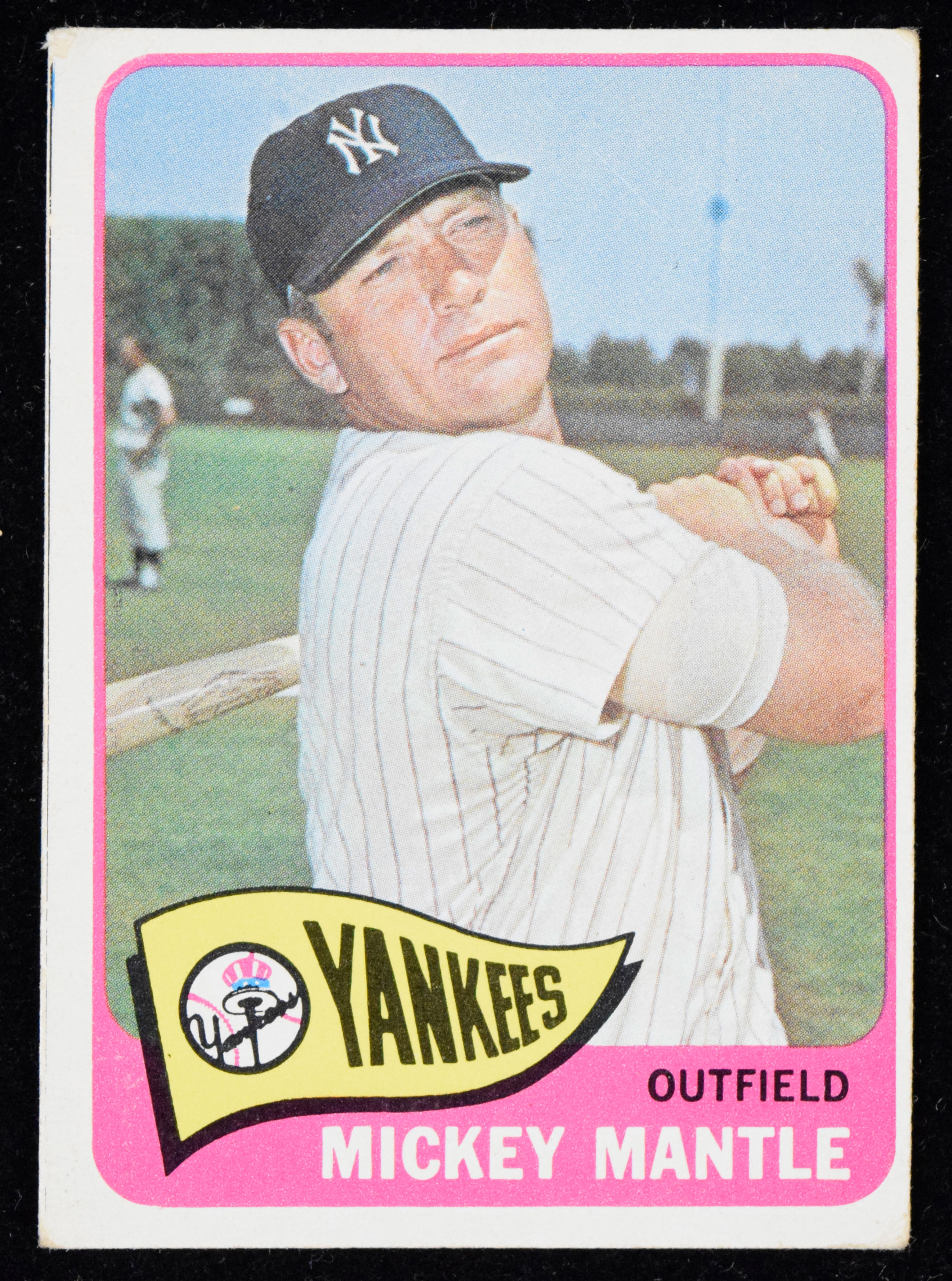 Description:1965 Topps #350 Mickey Mantle (VG). Popular card of the Hall of Famer is centered to the right, with moderate corner wear and a small corner crease in the upper left. Color on the back is slightly washed out, but back is otherwise clean: VG.