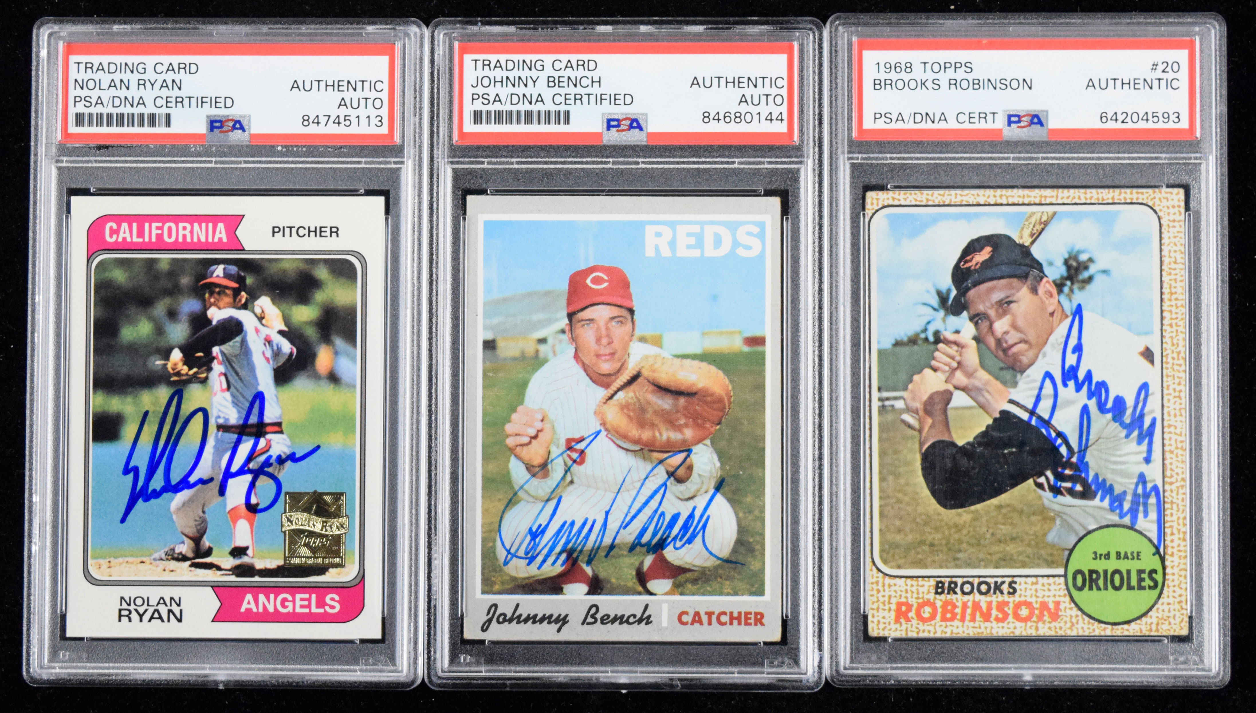 Description:Lot of (3) HOFer autographed baseball cards in PSA/DNA slabs, with Nolan Ryan, Johnny Bench & Brooks Robinson (Sigs. NM/MT). Outstanding lot of signed cards, with each autograph authenticated and encapsulated by PSA/DNA . Includes 1968 Topps #20 (VG) signed by Brooks Robinson, 1970 Topps #660 Johnny Bench (VG) signed by bench (noted as Trading Card only PSA flip) and 1998 Topps Nolan Ryan Reprint #7 (NM/MT) signed by Ryan (noted as Trading Card only on PSA flip). Signatures rate 8/9 out of 10.