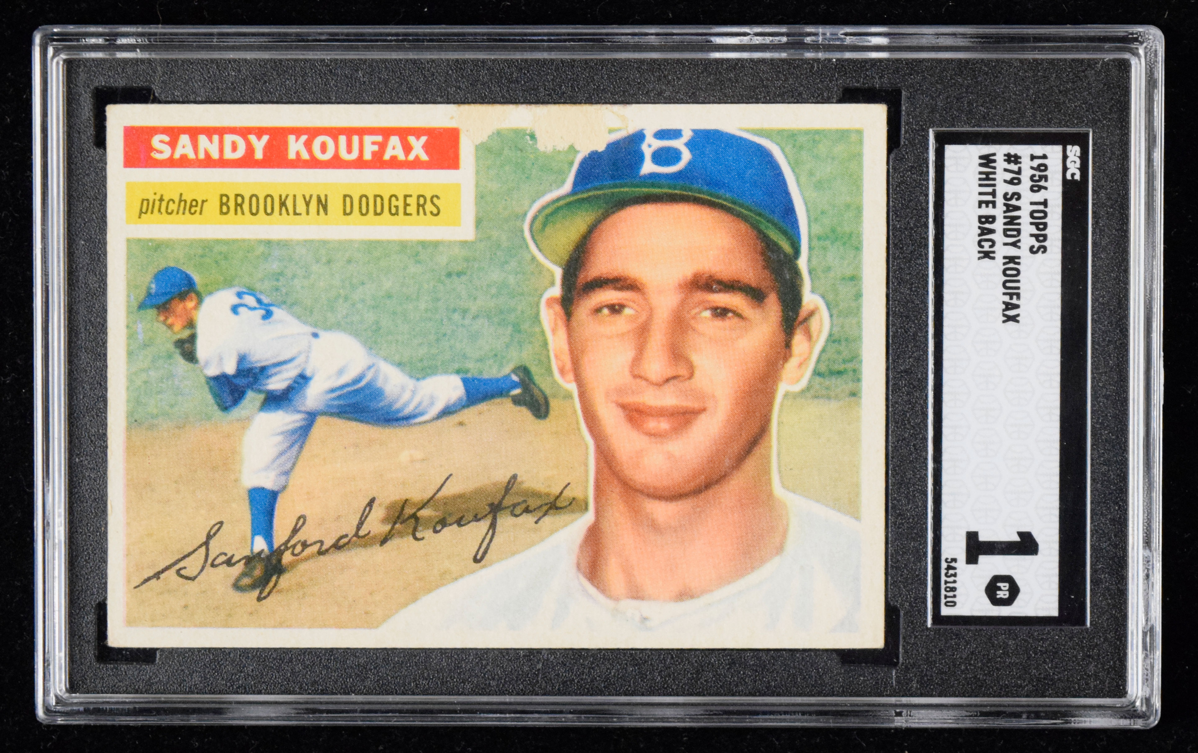 Description:1956 Topps #79 Sandy Koufax white back (SGC 1 PR). Card exhibits spots of paper loss along the top edge, along with light corner wear. Card is nicely centered front and back: SGC 1 PR.