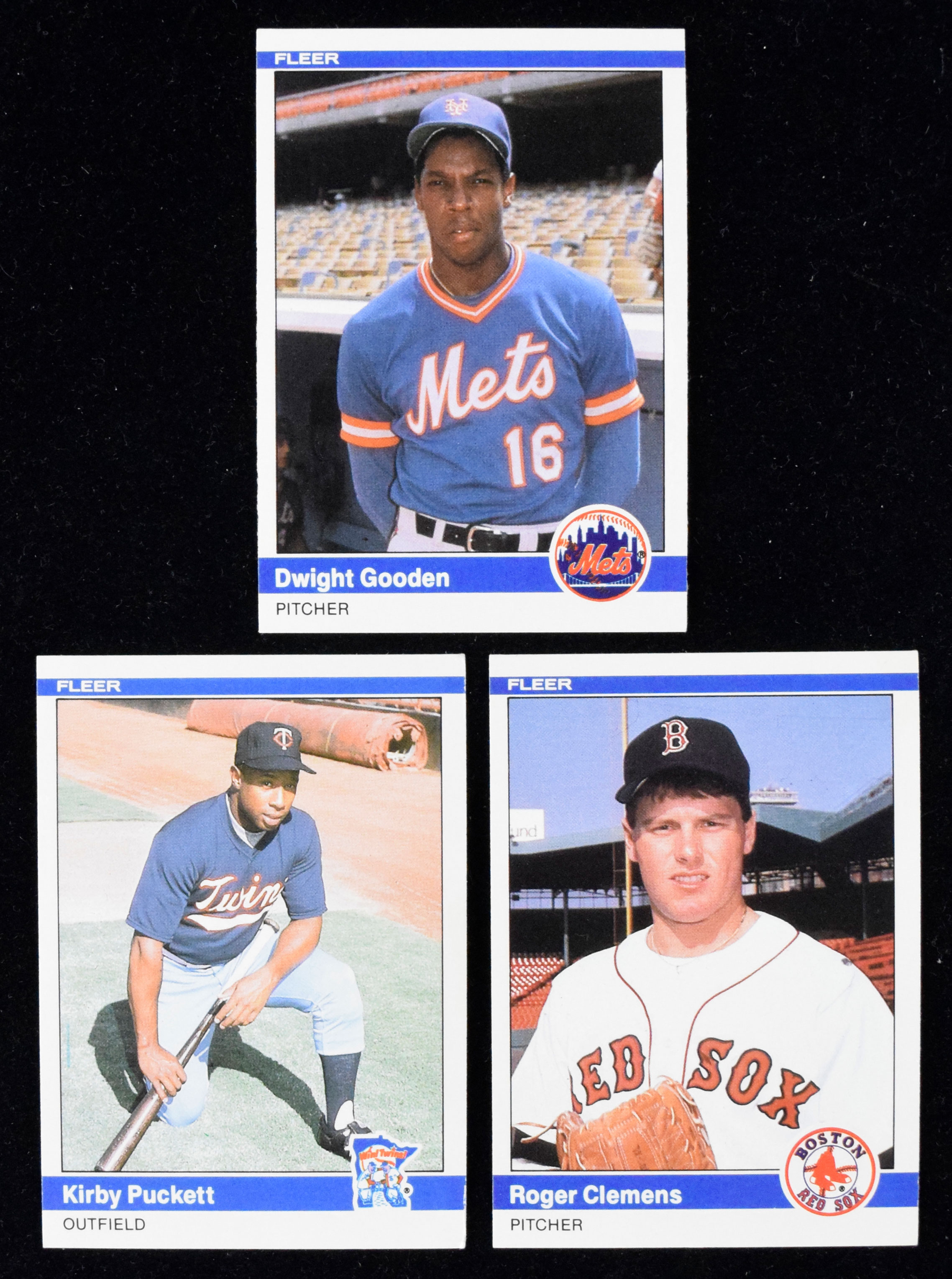 Description:Lot of (3) 1984 Fleer Update RCs, with Roger Clemens, Kirby Puckett and Roger Clemens (EX-NM/MT). Outstanding lot of the three key rookies from 1984 Fleer Update, with #U27 Roger Clemens (NM+), #U43 Dwight Gooden (NM/MT) and #U93 Kirby Puckett (EX). Range: EX-NM/MT.