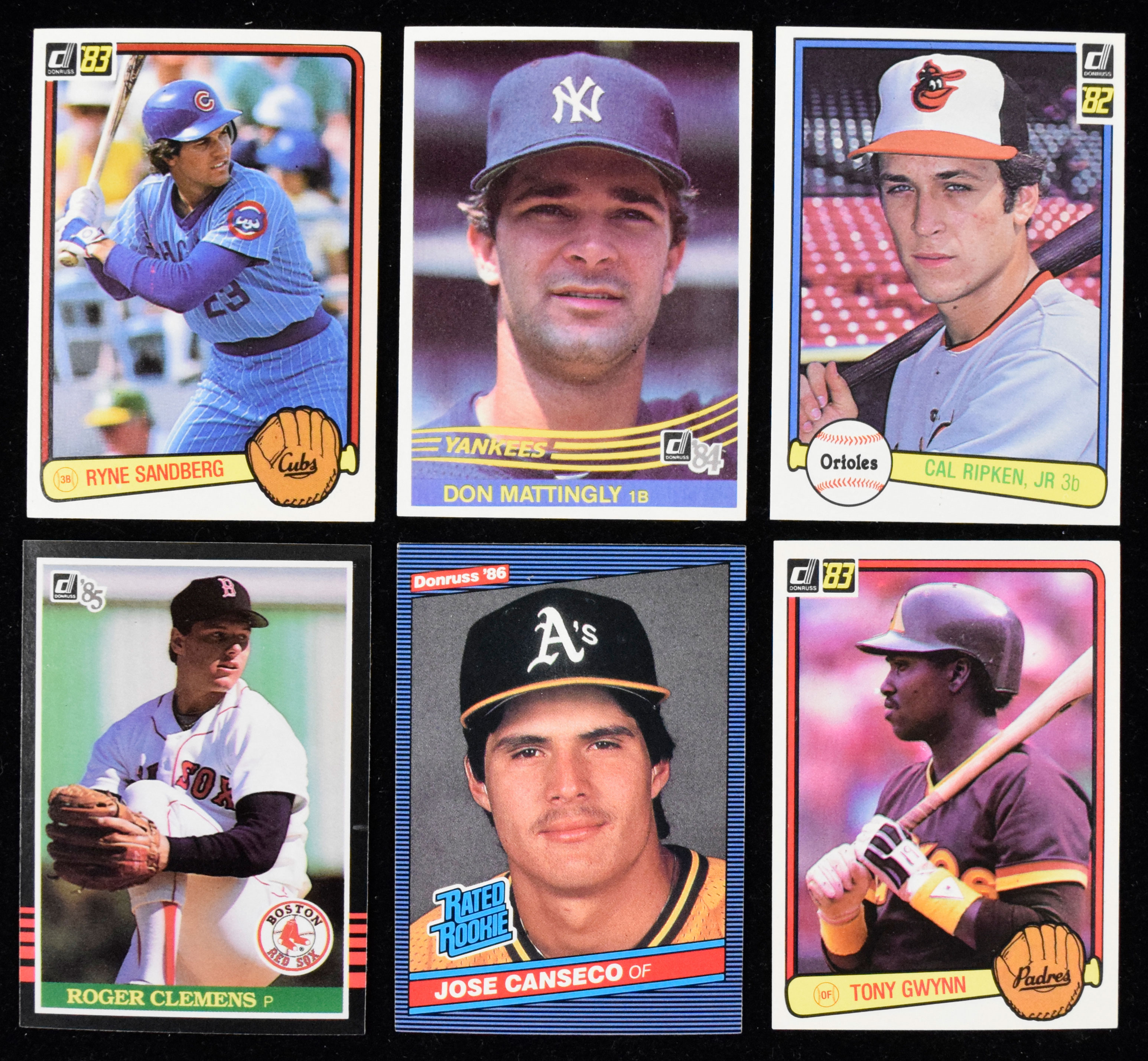 Description:Lot of (6) 1981-1986 Donruss complete sets with Mattingly, Ripken and Gwynn RCs (VG-NM/MT). Outstanding run of Donruss complete sets, featuring one set each from 1981, 1982, 1983, 1984, 1985 and 1986. Included are a broad array of key 80s RCs, including Cal Ripken Jr., Tony Gwynn, Wade Boggs, Ryne Sandberg, Don Mattingly, Darryl Strawberry, Roger Clemens, Kirby Puckett, Jose Canseco and more. All except 1981 are open factory box sets with writing on the tops and/or sides of the boxes. 1983 set has numerous cards with small writing in pencil on the backs (not on three key RCs), but all of the other sets appear to be free of writing. Most cards appear NM-NM/MT or better. Range: VG-MT (with note on writing on some cards in 1983).