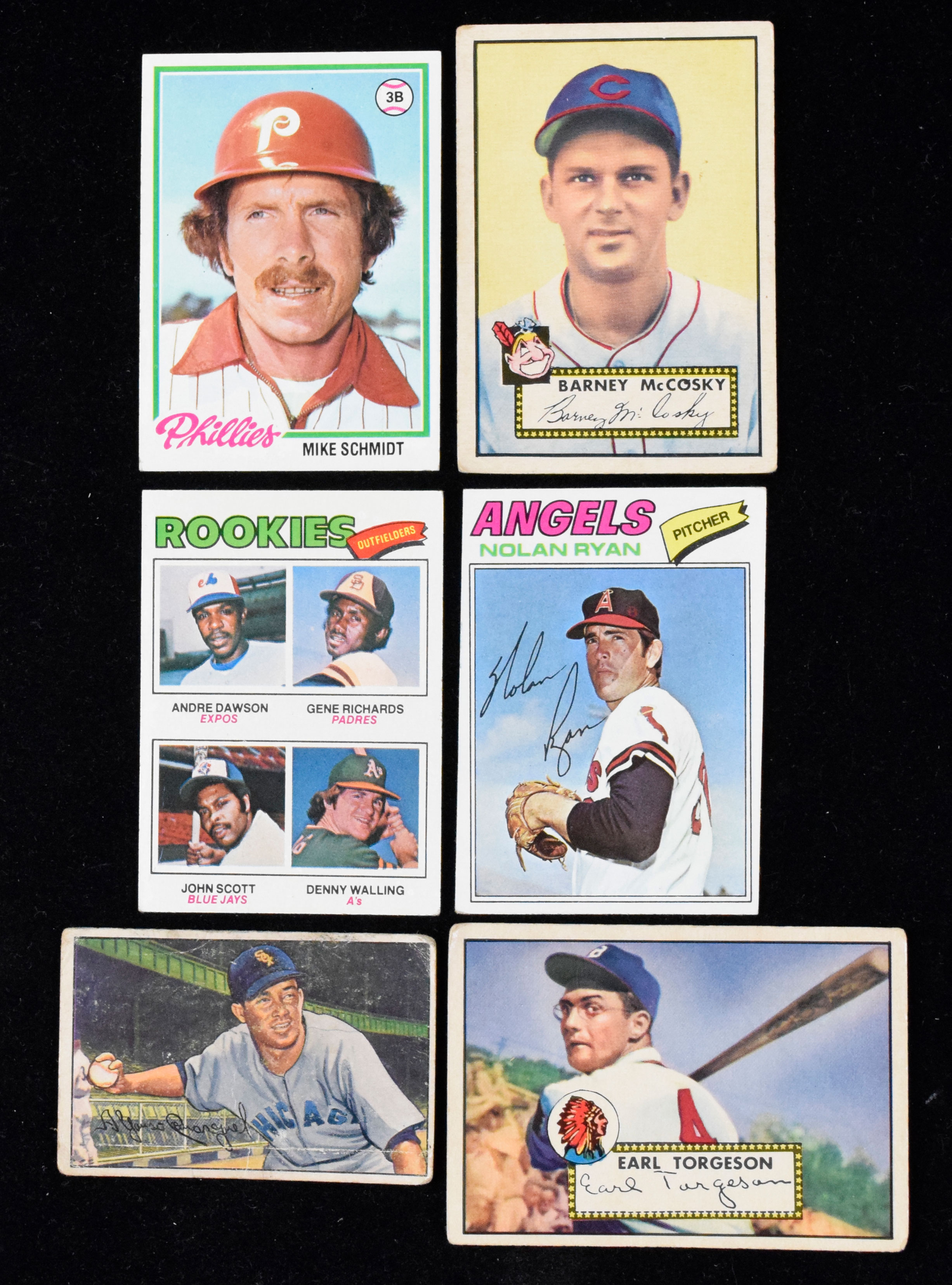 Description:Lot of approx. (1,100) 1952-1990s baseball cards with stars, including Nolan Ryan and Andre Dawson RC (PR-NM). Nice assortment of cards spanning the years 1952 through 1979, with the vast majority in the early to late 1970s. Highlights include (3) 1952 Topps commons; (3) 1952 Bowman commons and (6) 1953-1969 Topps and Bowman commons. Remainder of the lot includes: Approx. (200) 1972-1974 Topps minor stars and commons; (75+) 1975 Topps minor stars and commons, plus #622 Fred Lynn RC; (200+) 1976 Topps minor stars and commons; approx. (150+) 1977 Topps cards with stars including #640 Carlton Fisk, #265 Mark Fidrych RC, #110 Steve Carlton, #70 Johnny Bench, #473 Andre Dawson RC, #650 Nolan Ryan and #152 Gaylord Perry; (50+) 1978 Topps with stars including #60 Thurman Munson, #170 Lou Brock (writing on back), #270 Carlton Fisk, #20 Pete Rose (writing on back), #100 George Brett, #580 Rod Carew (writing on back), #540 Steve Carlton (writing on back), #360 Mike Schmidt, #40 Carl Yastrzemski and more. Also included in the lot are (300+) late 1970s-1990s TCMA, SSPC, Swell and other issues, plus one 1984 Donruss card. Most of the cards appear VG/EX and there are a small number of cards with writing sprinkled around the lot. Range: PR-NM (with note on writing).