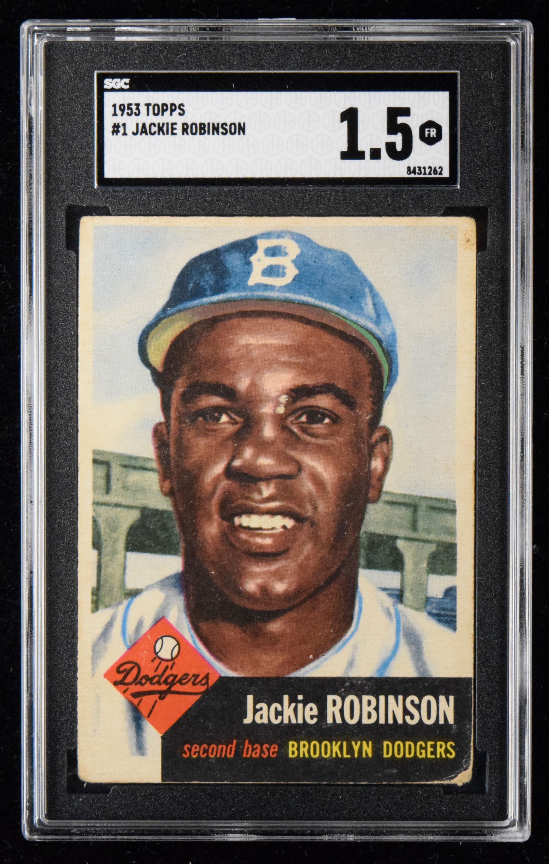 Description:1953 Topps #1 Jackie Robinson (SGC 1.5 FR). Classic card of the Hall of Famer retains excellent eye appeal, despite heavily rounded corners and what appears to be two small imperfections and light wrinkles near Robinson's eye. Back has a couple of horizontal wax stains: SGC 1.5 FR.