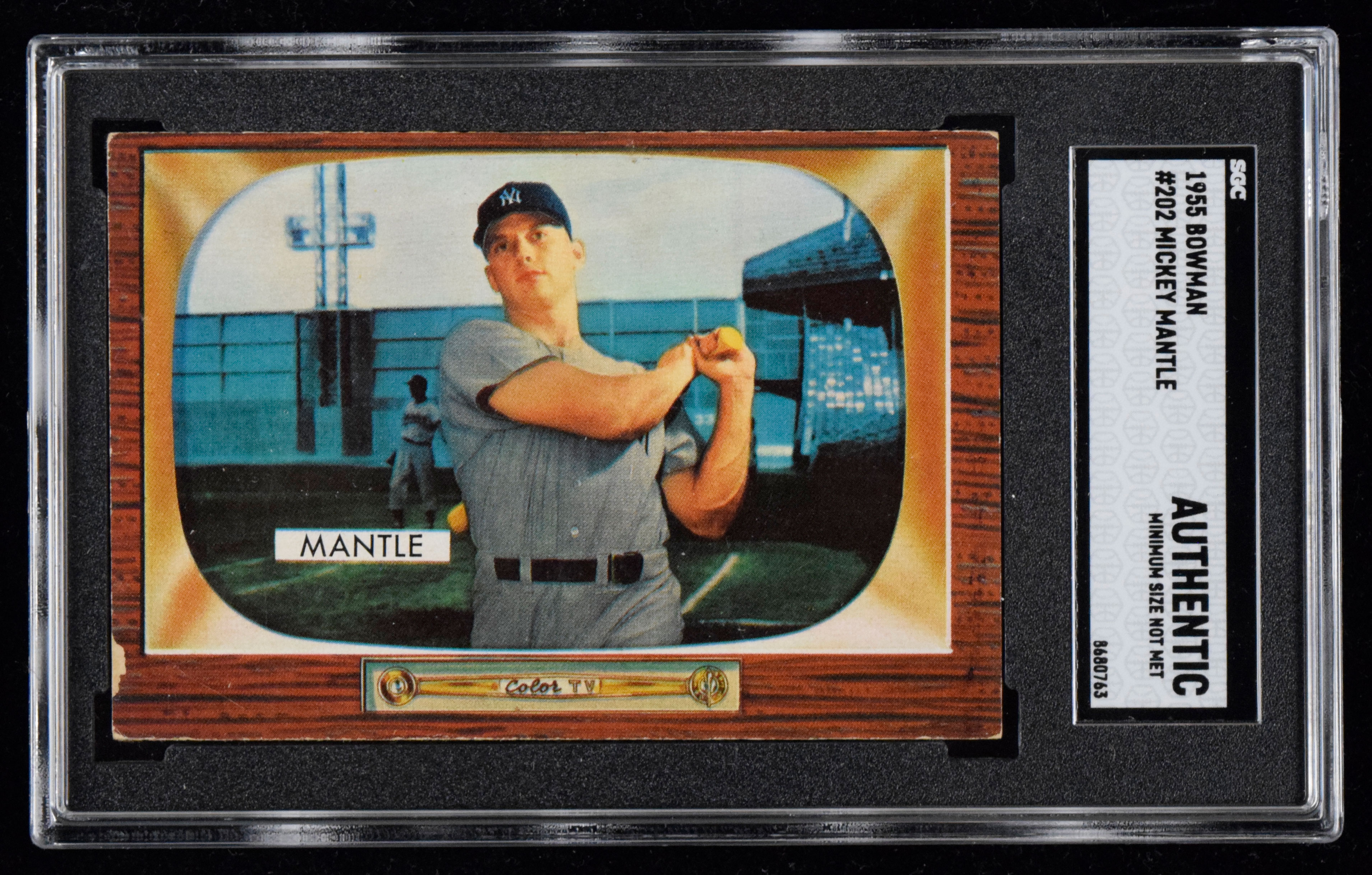Description:1955 Bowman #202 Mickey Mantle (SGC Authentic/Min. Size). Card has GD-VG overall appearance with a small spot of paper loss on the lower left edge, minor wear on four corners and a clean back. Card does not meet the minimum size requirement and has been holdered by SGC as Authentic.