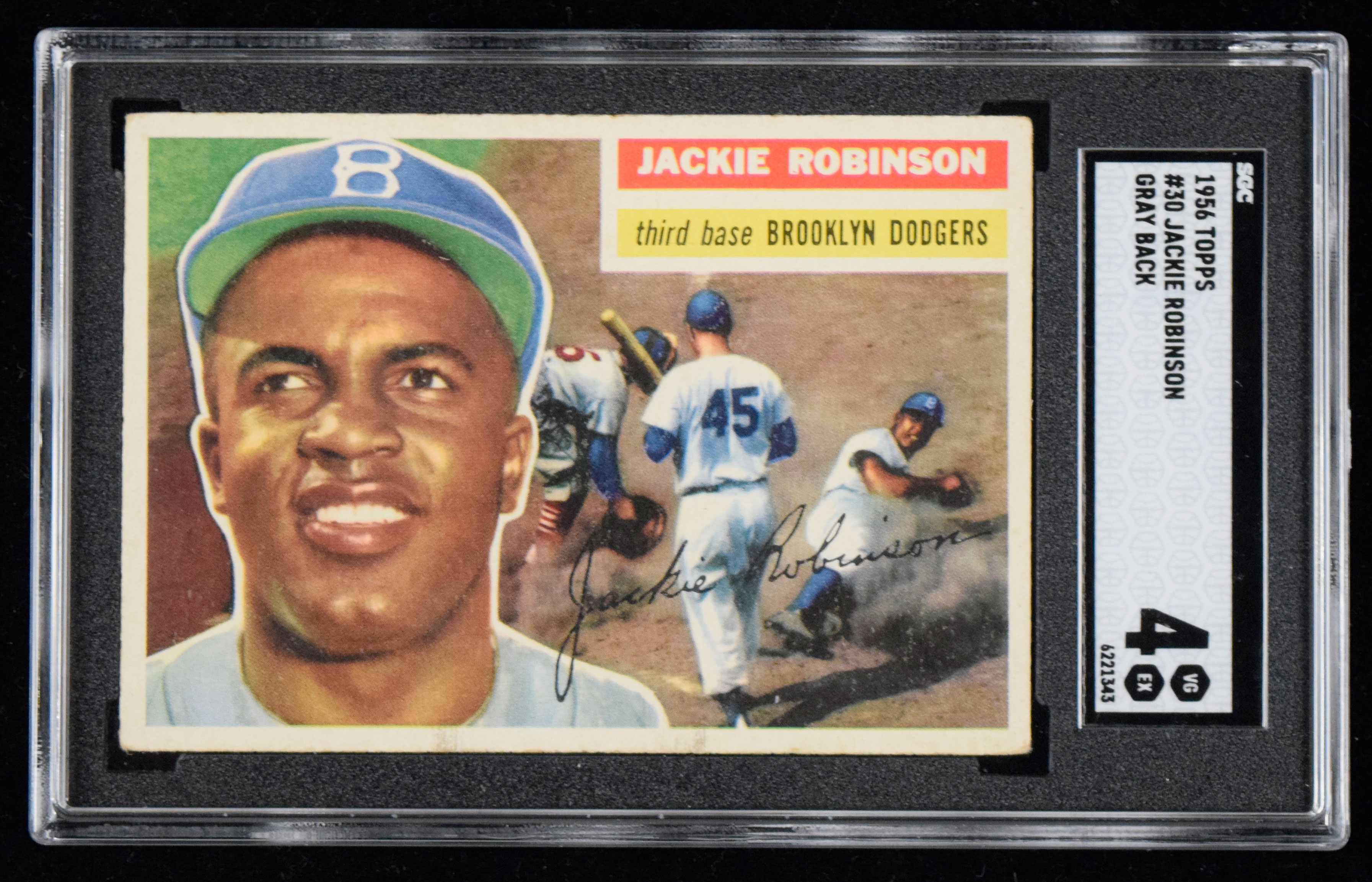 Description:1956 Topps #30 Jackie Robinson Gray Back (SGC 4 VG/EX). Classic card of the Hall of Famer is nicely centered, with moderate corner wear and a couple of print defects on the bottom border. Back has a small wax stain but is otherwise clean: SGC 4 VG/EX.