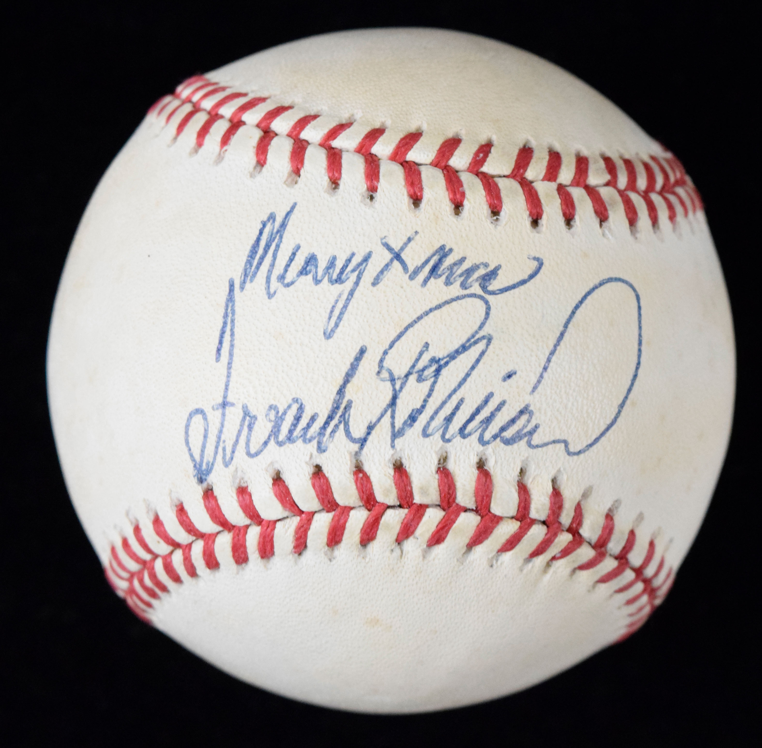 Description:Frank Robinson signed "Merry Xmas" baseball (EX). B.Brown AL ball signed by Robinson in blue ink with "Merry Xmas" inscription. Signature rates 9 out of 10. Scattered areas of toning on each panel: EX MERRY CHRISTMAS