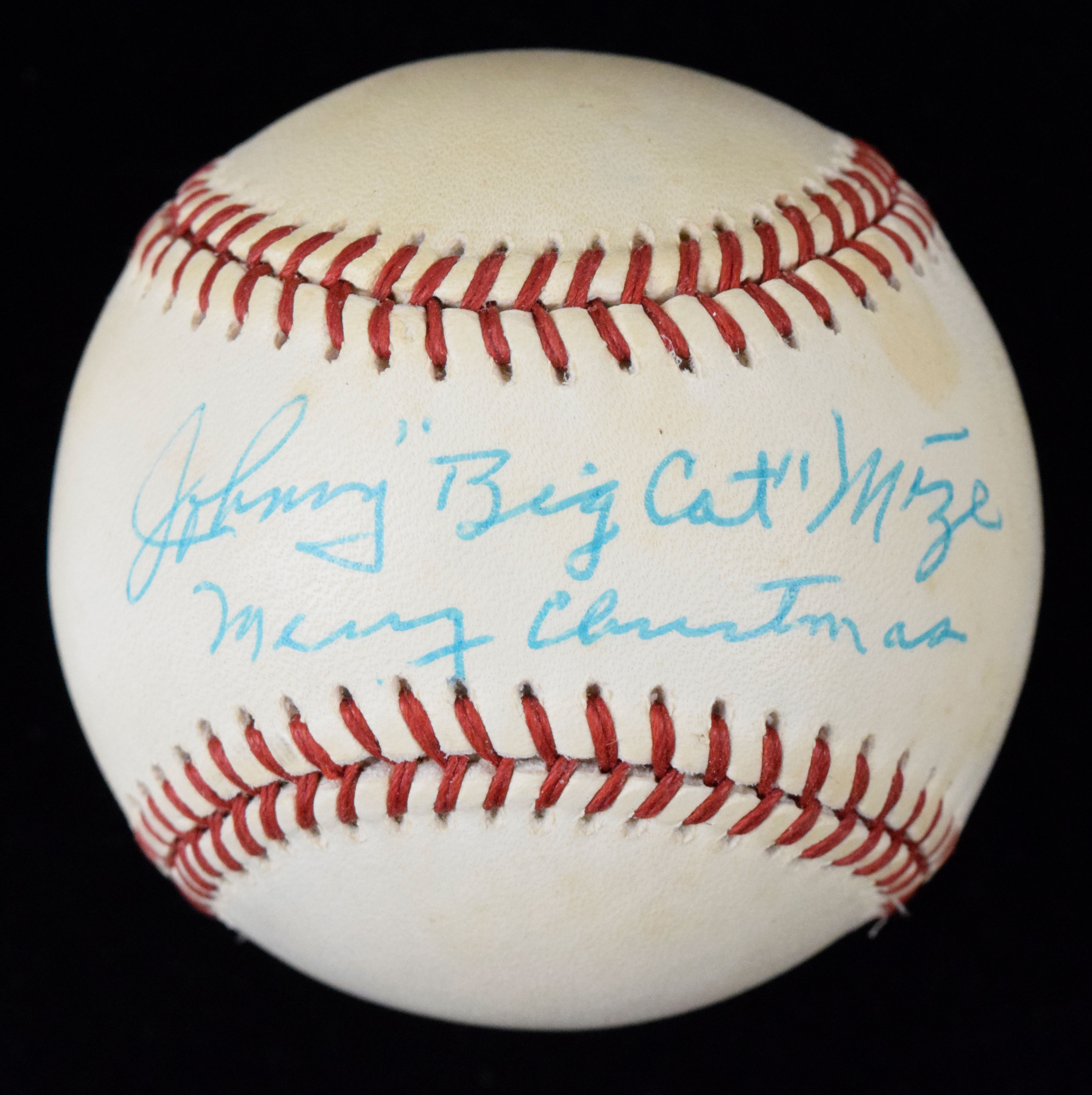 Description:Johnny "Big Cat" Mize signed "Merry Christmas" baseball (EX). W.White NL ball signed by Mize in blue ink with "Merry Christmas" inscription. Signature rates 8/9 out of 10. Scattered areas of light to moderate toning: EX MERRY CHRISTMAS