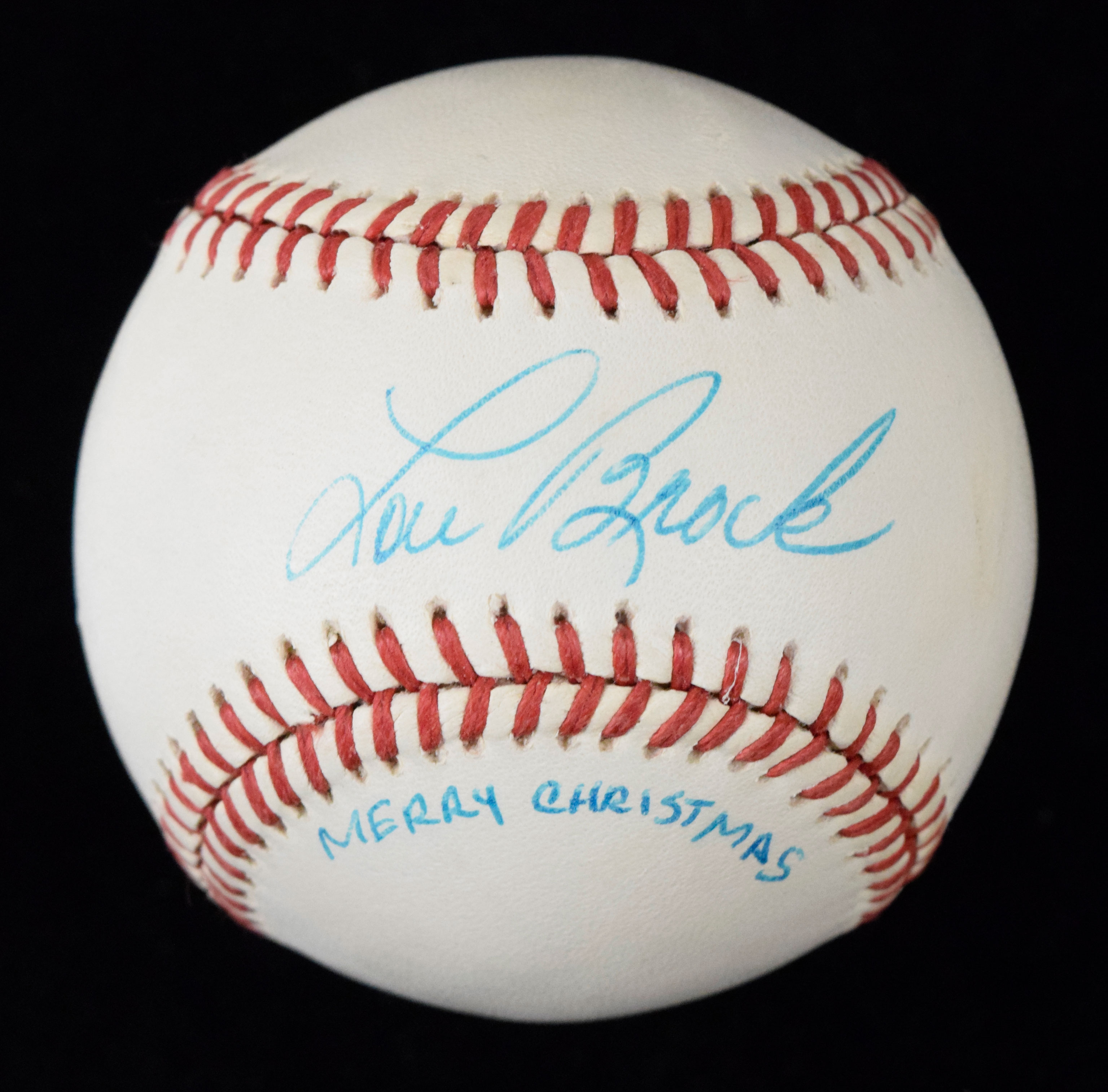 Description:Lou Brock signed "Merry Christmas" baseball (EX/MT). W.White NL ball signed by Brock in blue ink with "Merry Christmas" inscription. Signature rates 9 out of 10. Light toning on the side panels: EX/MT MERRY CHRISTMAS