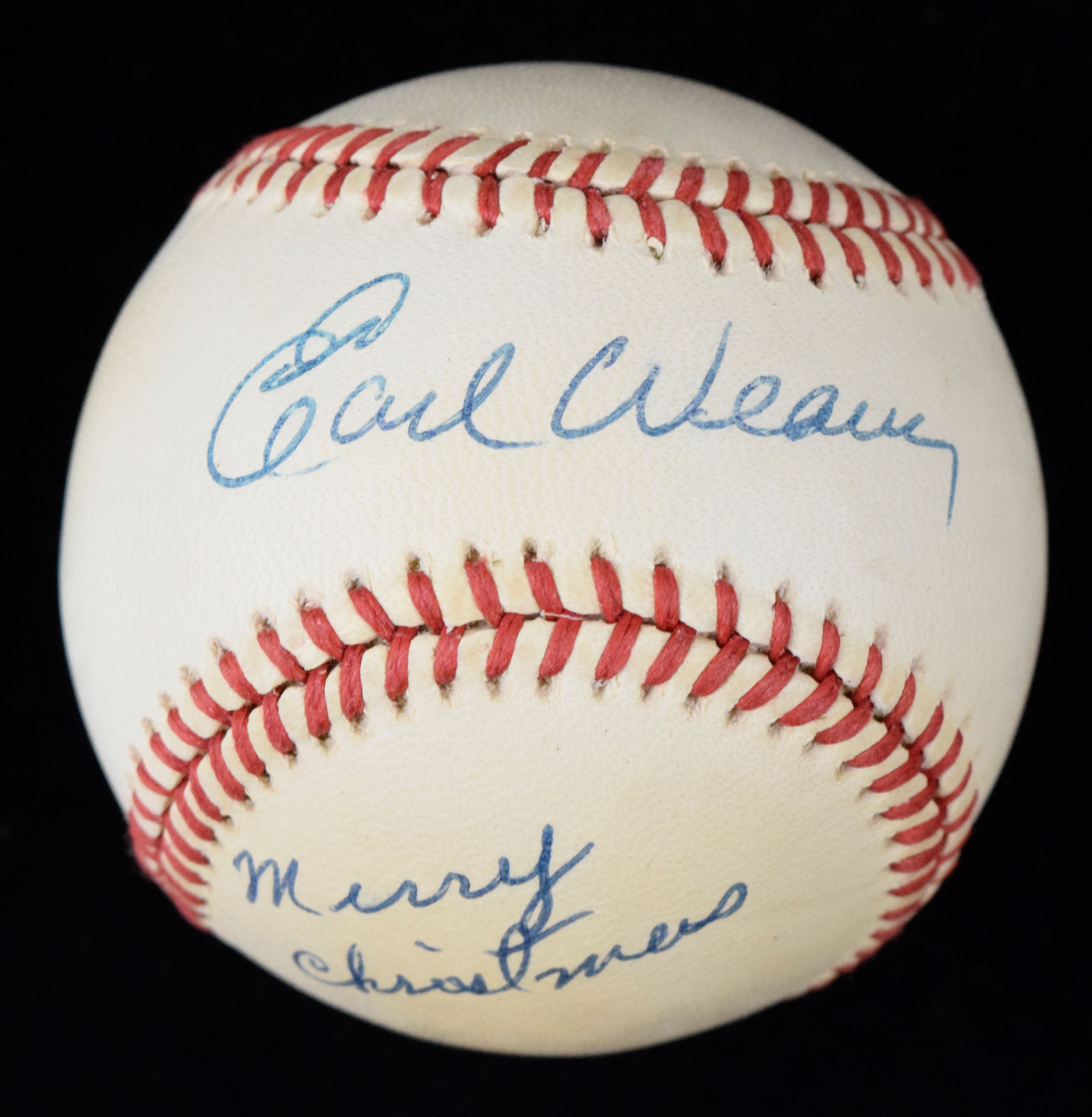 Description:Earl Weaver signed "Merry Christmas" baseball (EX). B.Brown AL ball signed by Weaver in blue ink with "Merry Christmas" inscription. Signature rates 9 out of 10. Light to moderate toning on each panel: EX MERRY CHRISTMAS