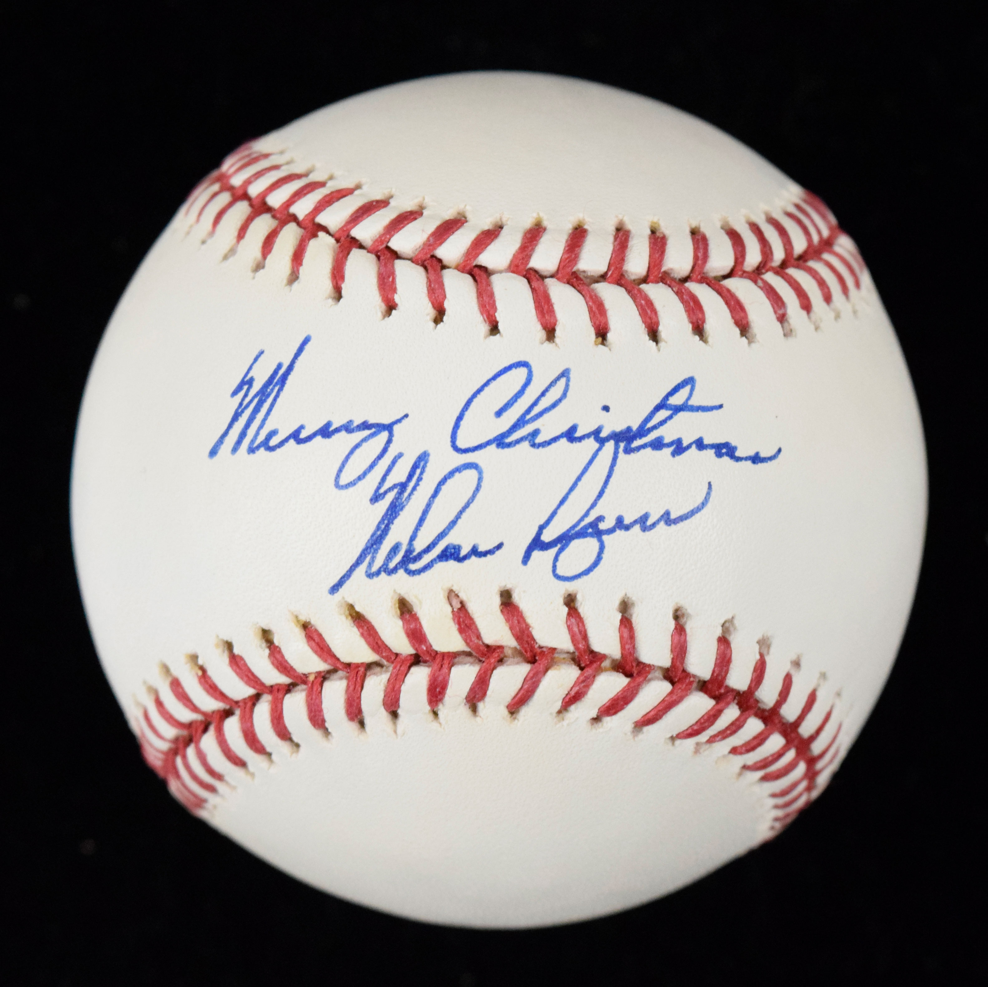 Description:Nolan Ryan signed "Merry Christmas" baseball - Ryan authenticated (EX/MT). B.Selig ML ball signed by Ryan in blue ink with "Merry Christmas" inscription. Signature rates 9 out of 10. Nolan Ryan hologram sticker is on the ball. Area of toning away frm the autograph: EX/MT MERRY CHRISTMAS