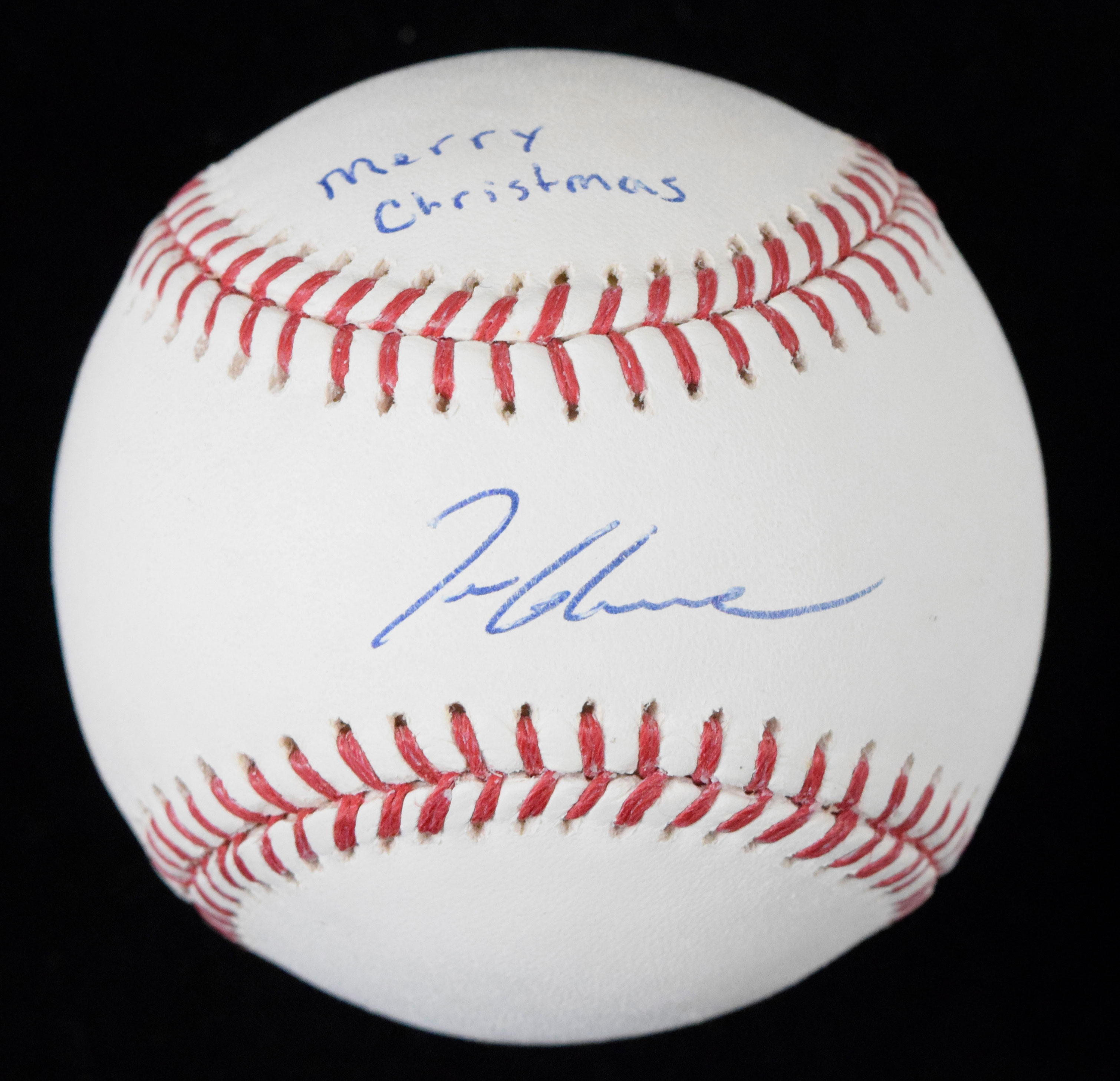 Description:Tom Glavine signed "Merry Christmas" baseball - Tri-Star (NM). B.Selig ML ball signed by Glavine in blue ink with "Merry Christmas" inscription. Signature rates 8/9 out of 10. Tri-Star serial #ed hologram sticker is on the ball: NM MERRY CHRISTMAS