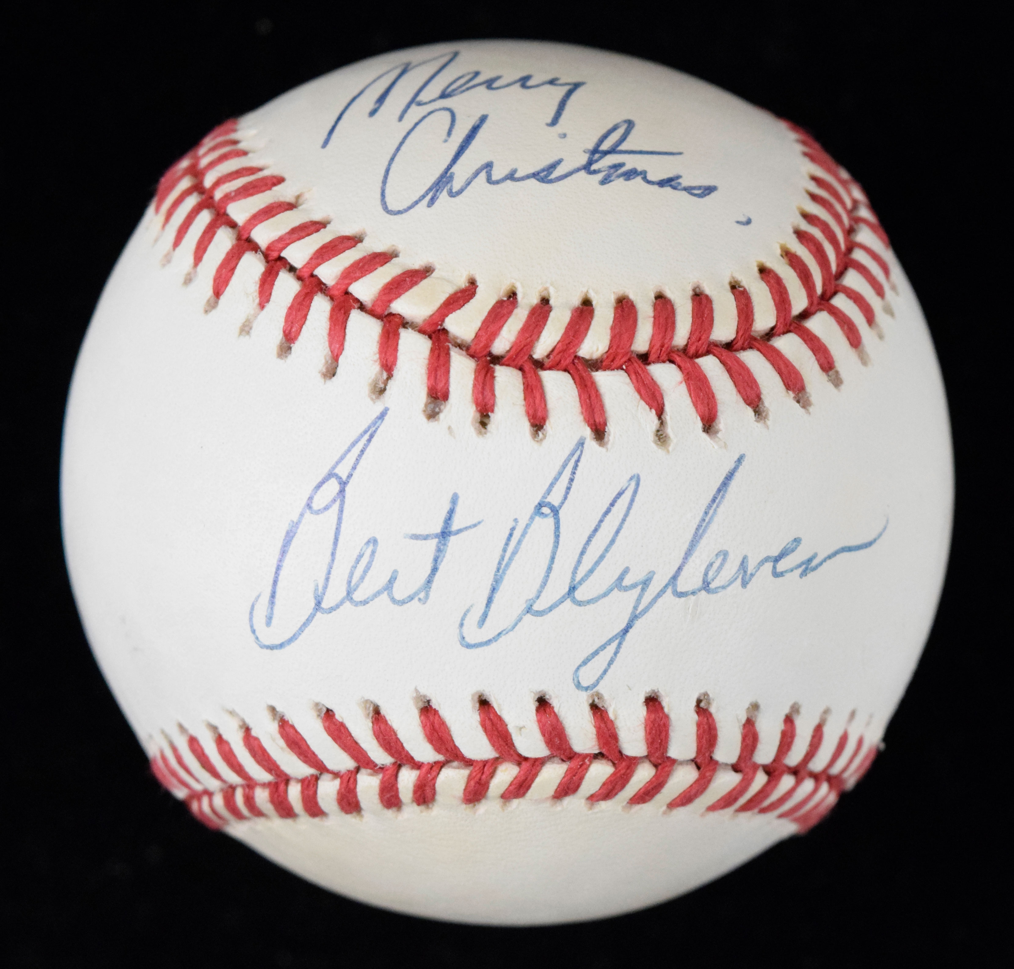 Description:Bert Blyleven signed "Merry Christmas" baseball (EX). B.Brown AL ball signed by Blyleven in blue ink with "Merry Christmas" inscription. Signature rates 8/9 out of 10. Toning mainly on the panel below the autograph: EX MERRY CHRISTMAS