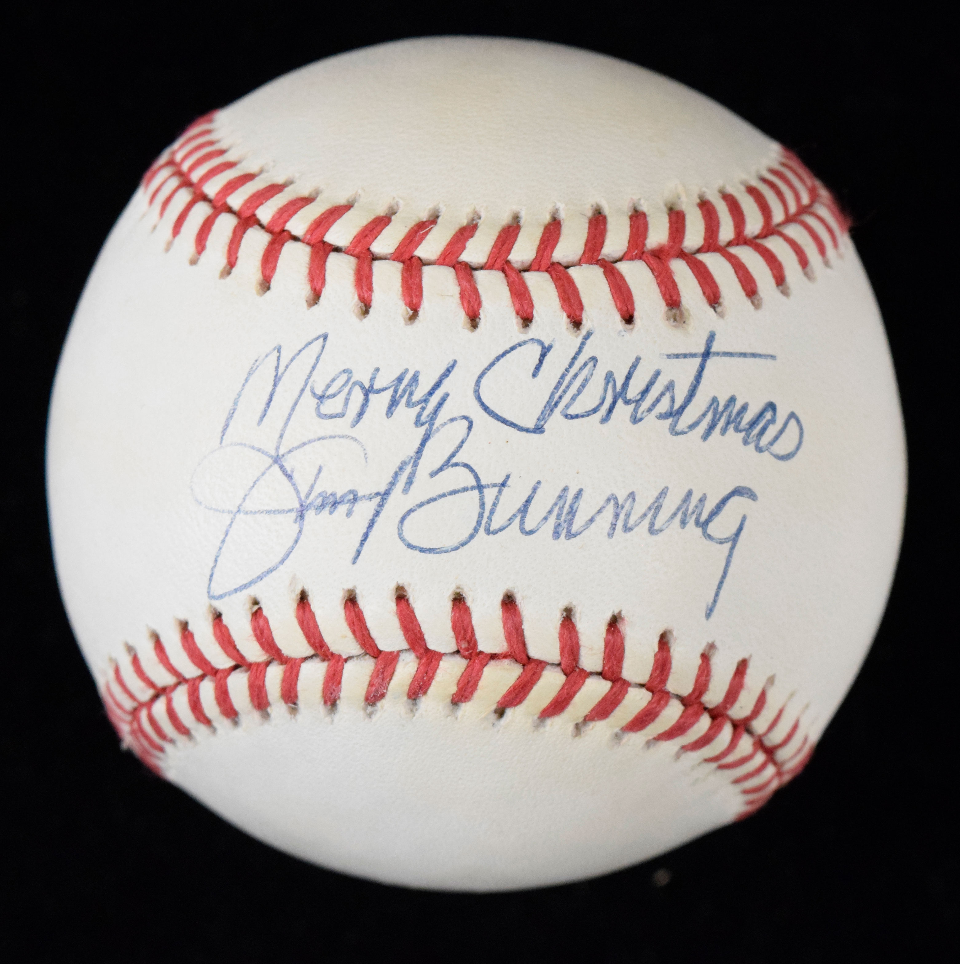 Description:Jim Bunning signed "Merry Christmas" baseball (EX/MT). W.White NL ball signed by Bunning in blue ink with "Merry Christmas" inscription. Signature rates 8/9 out of 10. Scattered spots of light toning: EX/MT MERRY CHRISTMAS