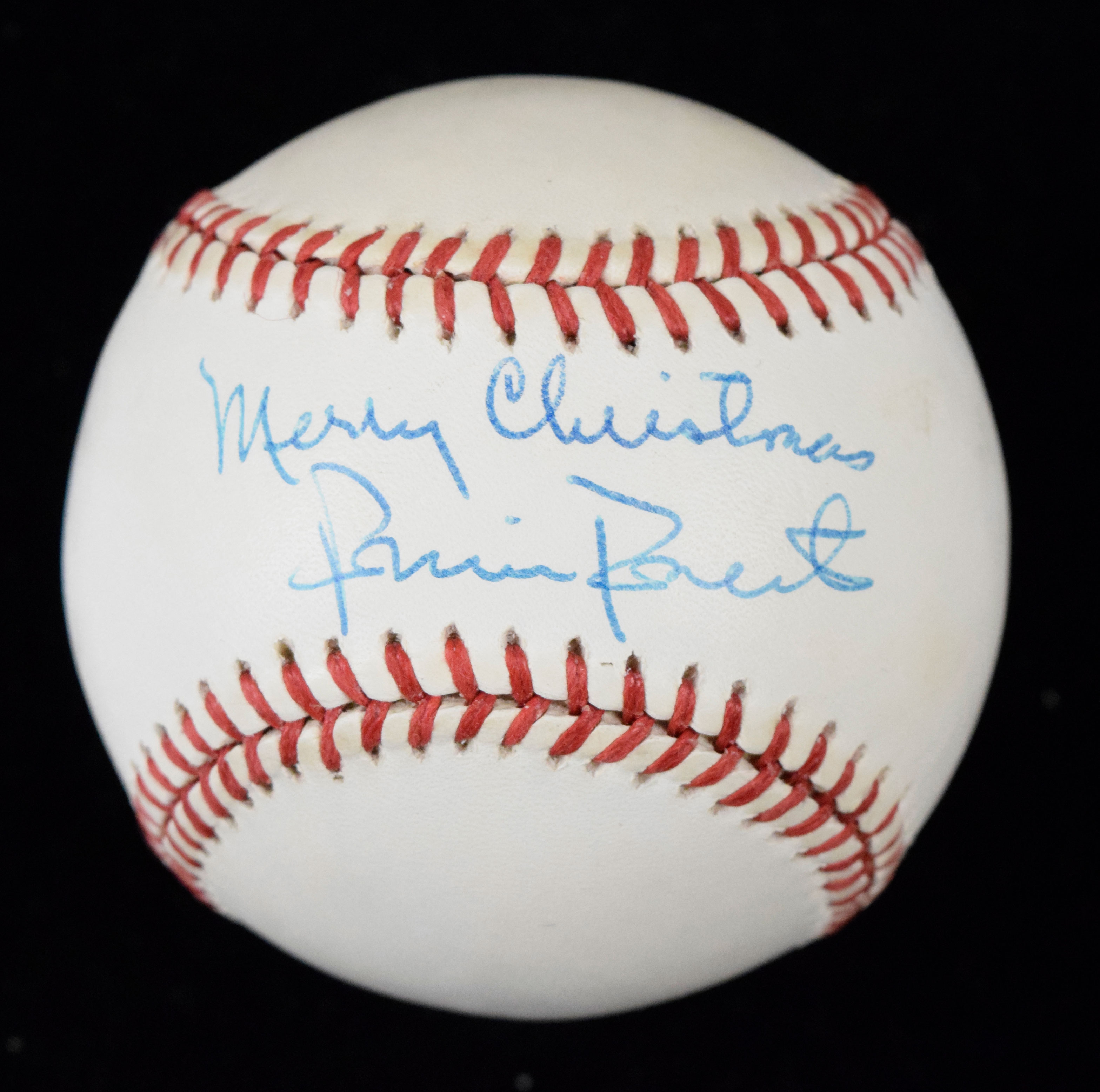 Description:Robin Roberts signed "Merry Christmas" baseball (EX-EX/MT). W.White NL ball signed by Roberts in blue ink with "Merry Christmas" inscription. Signature rates 9 out of 10. Areas of light to moderate toning on the side panels: EX-EX/MT MERRY CHRISTMAS