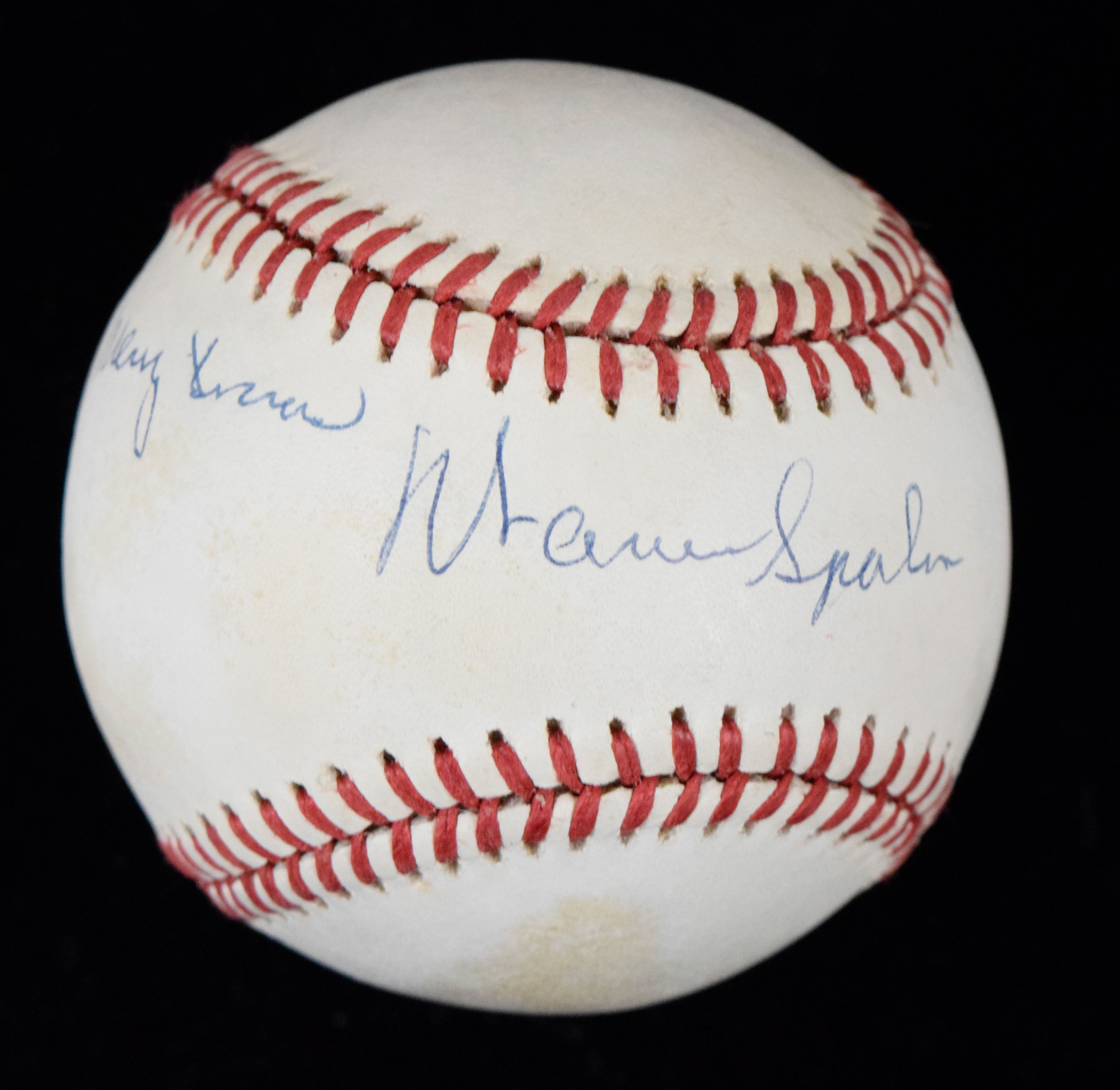 Description:Warren Spahn signed "Merry Xmas" baseball (VG/EX-EX). W.White NL ball signed by Spahn in blue ink with "Merry Xmas" inscription. Signature rates 8/9 out of 10. Scattered areas of toning: VG/EX-EX MERRY CHRISTMAS