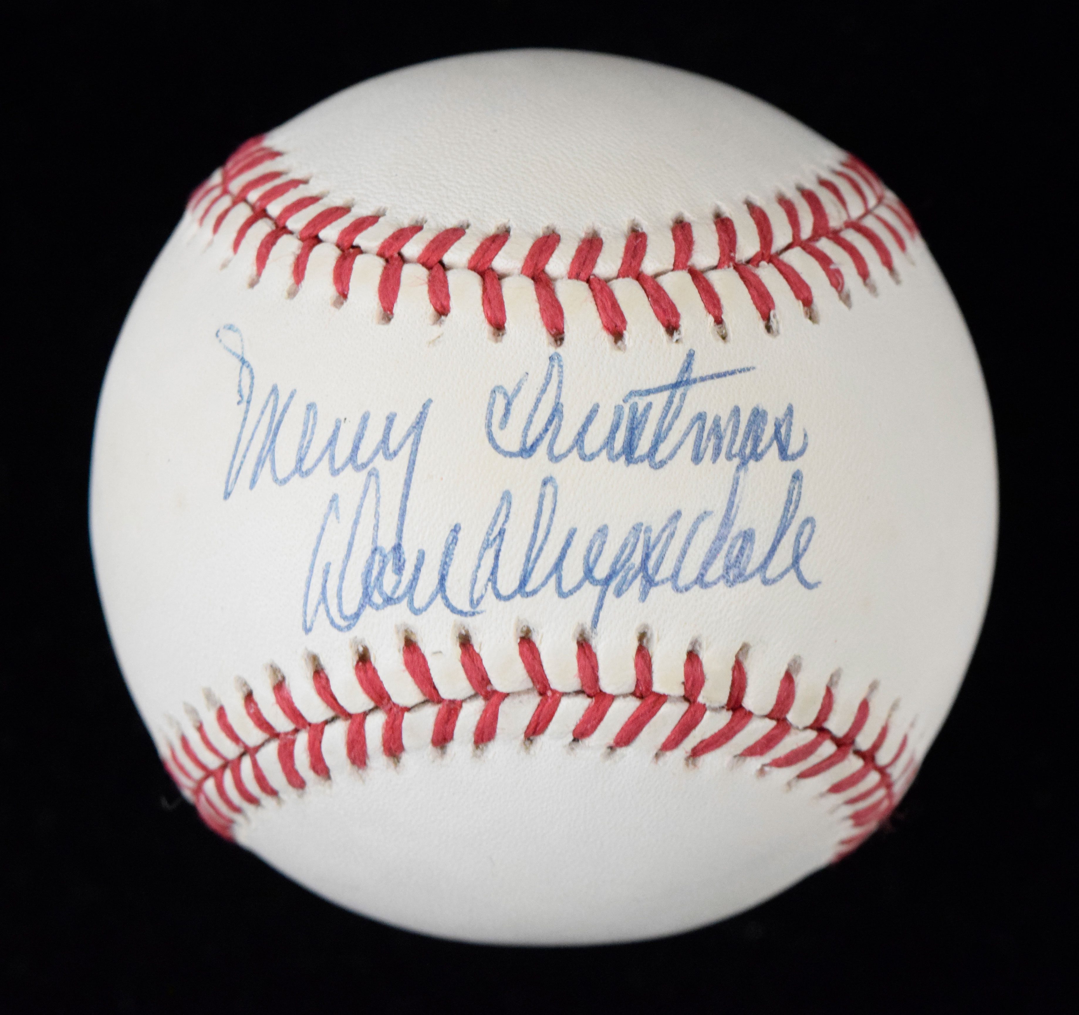 Description:Don Drysdale signed "Merry Christmas" baseball (EX/MT). W.White NL ball signed by Drysdale in blue ink with "Merry Christmas" inscription. Signature rates 9 out of 10. Light toning: EX/MT MERRY CHRISTMAS