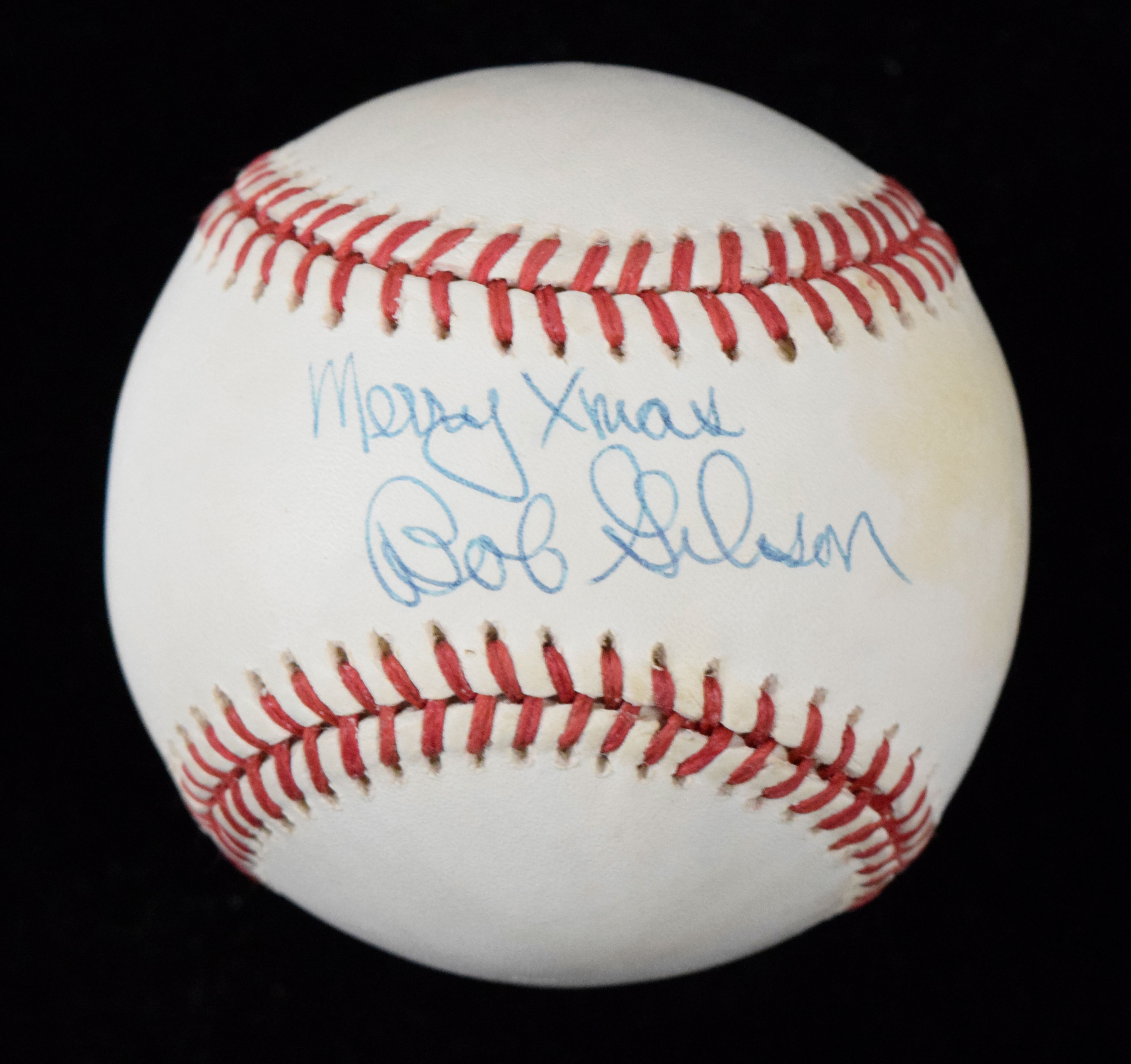 Description:Bob Gibson signed "Merry Xmas" baseball (EX). W.White NL ball signed by Gibson in blue ink with "Merry Xmas" inscription. Signature rates 9 out of 10. Toning mainly on the panel to the right of the autograph: EX MERRY CHRISTMAS