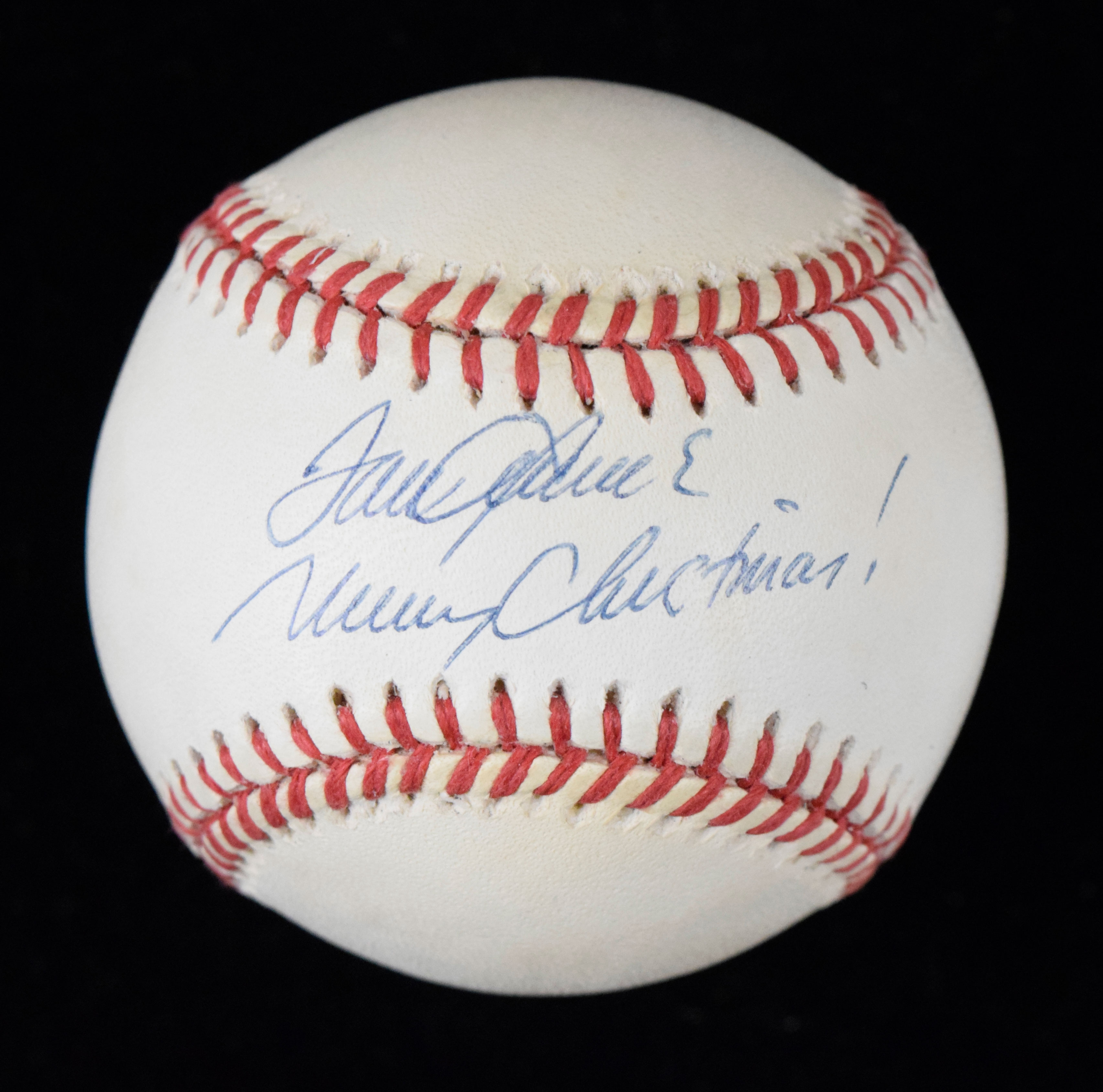 Description:Tom Seaver signed "Merry Christmas" baseball (EX-EX/MT). W.White NL ball signed by Seaver in blue ink with "Merry Christmas!" inscription. Signature rates 9 out of 10. Areas of light toning on each panel: EX-EX/MT MERRY CHRISTMAS