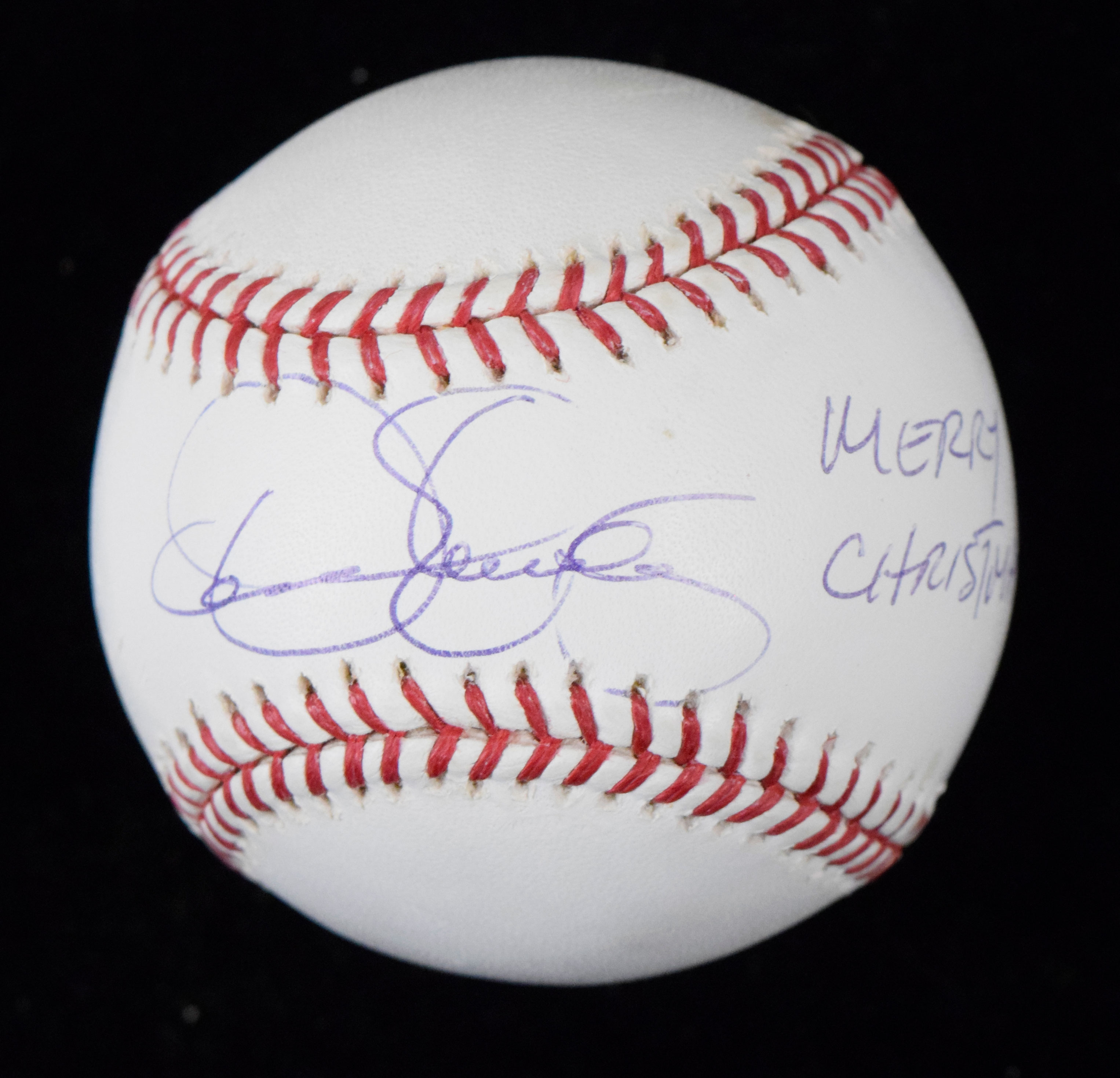 Description:Dennis Eckersley signed "Merry Christmas" baseball (EX/MT). B.Selig ML ball signed by Eckersley in blue ink with "Merry Christmas!" inscription. Signature rates 8/9 out of 10. Small spots of light toning: EX/MT MERRY CHRISTMAS