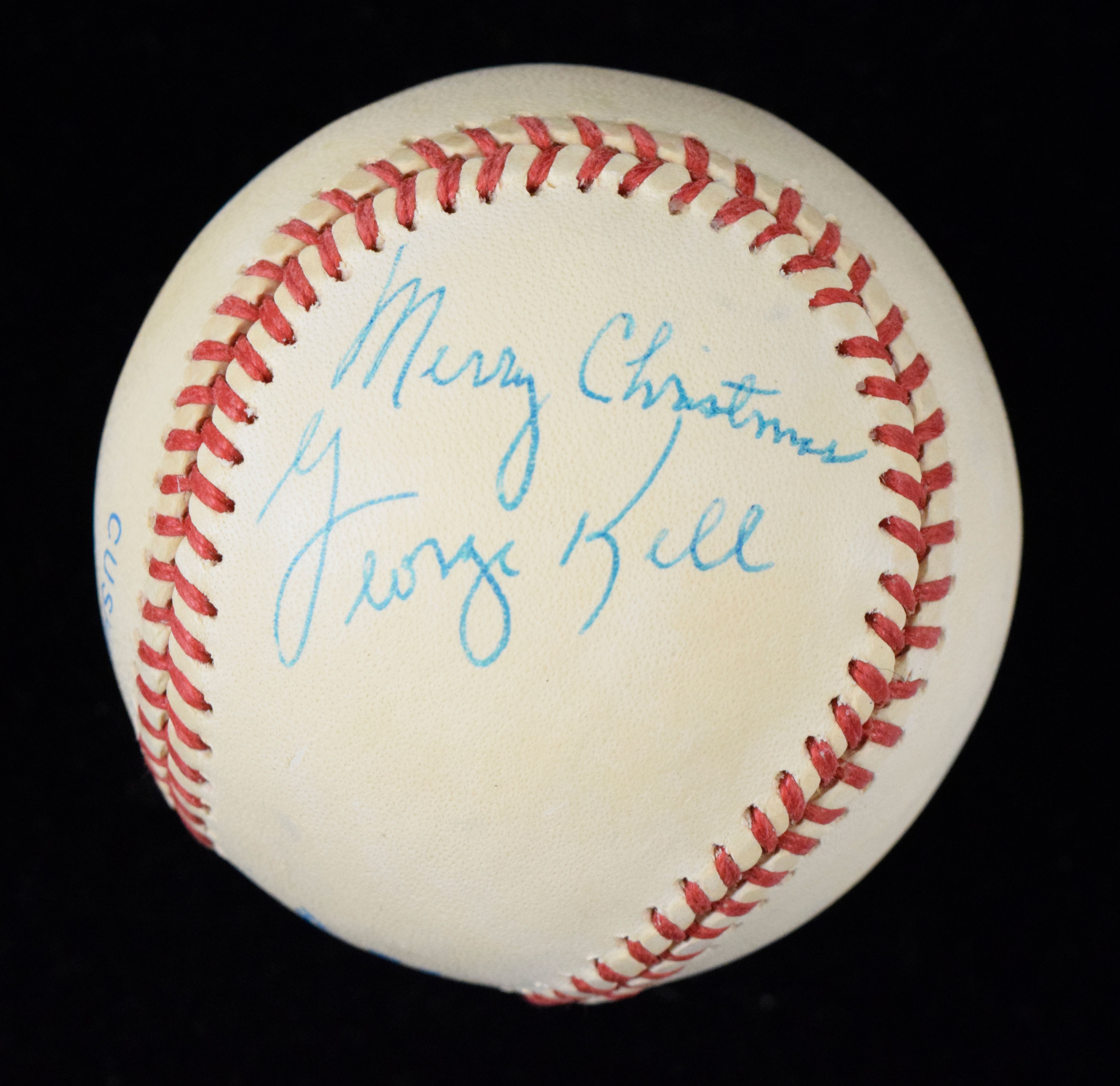 Description:George Kell signed "Merry Christmas" baseball (EX). B.Brown AL ball signed by Kell in blue ink with "Merry Christmas" inscription. Signature rates 9 out of 10. Moderate, even toning on each panel: EX MERRY CHRISTMAS