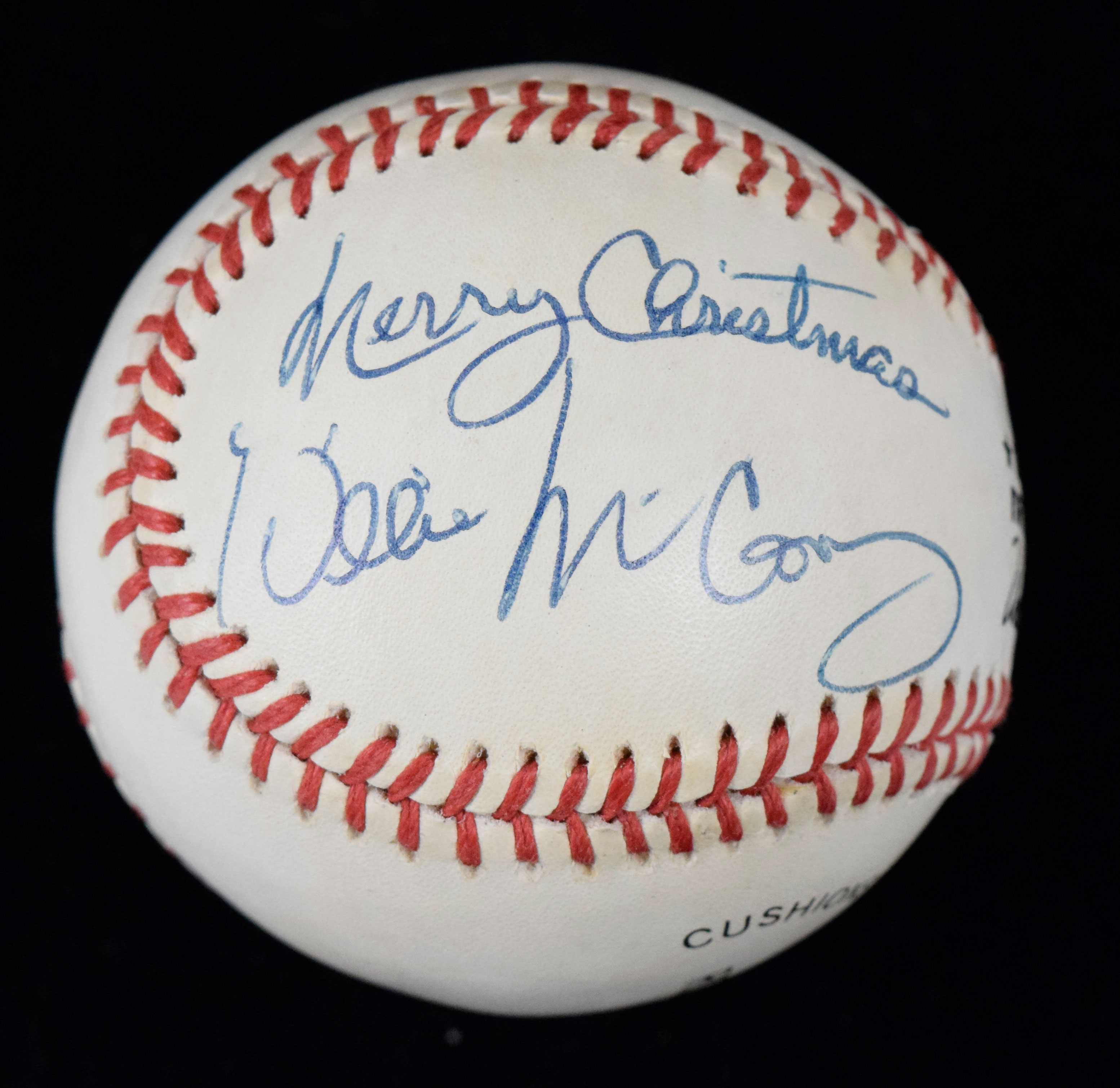 Description:Willie McCovey signed "Merry Christmas" baseball (EX). W.White NL ball signed by McCovey in blue ink with "Merry Christmas" inscription. Signature rates 9 out of 10. Areas of light to moderate toning on each panel: EX MERRY CHRISTMAS