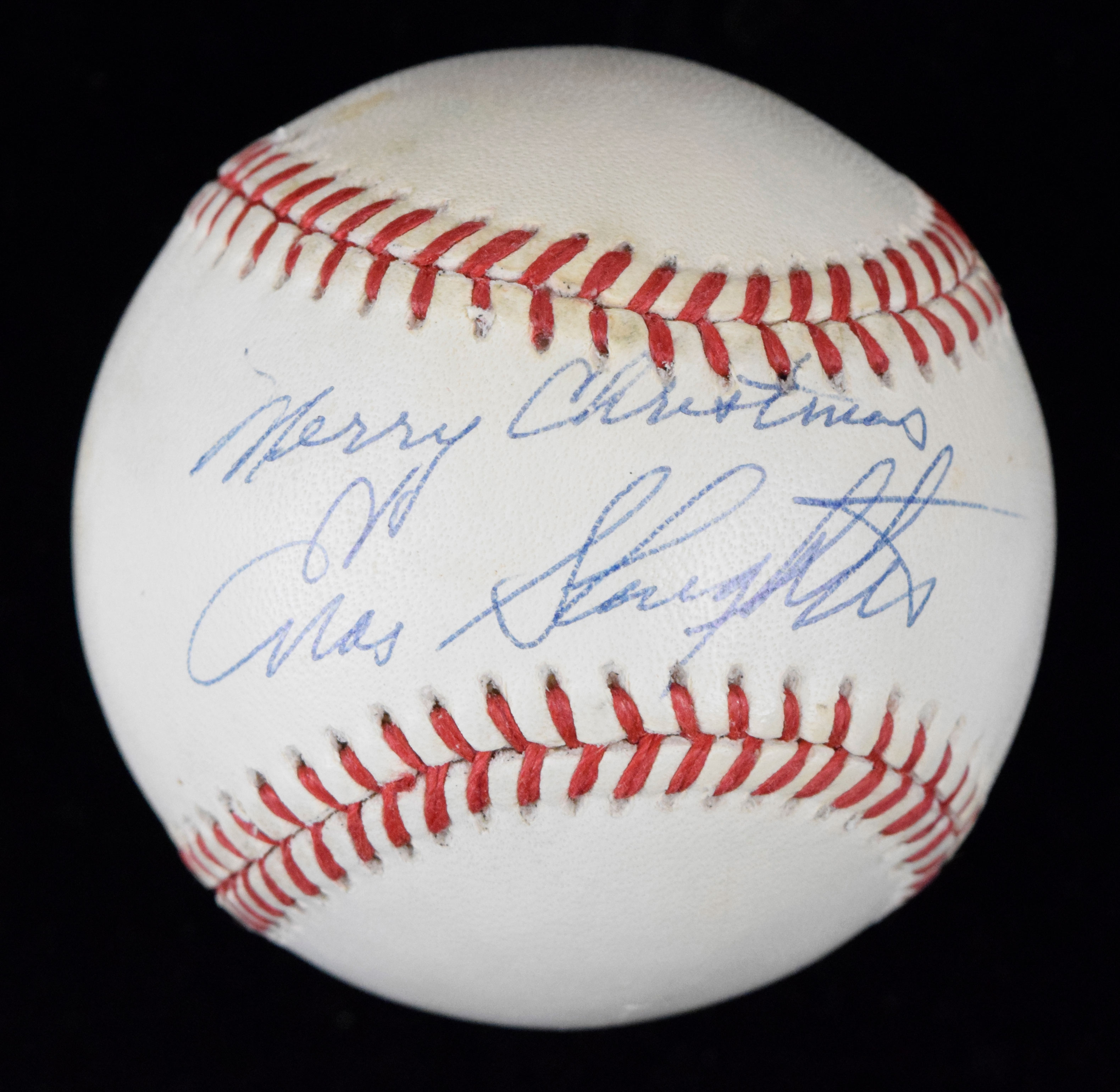 Description:Enos Slaughter signed "Merry Christmas" baseball (EX). W.White NL ball signed by Slaughter in blue ink with "Merry Christmas" inscription. Signature rates 8/9 out of 10. Areas of light to moderate toning on each panel: EX MERRY CHRISTMAS