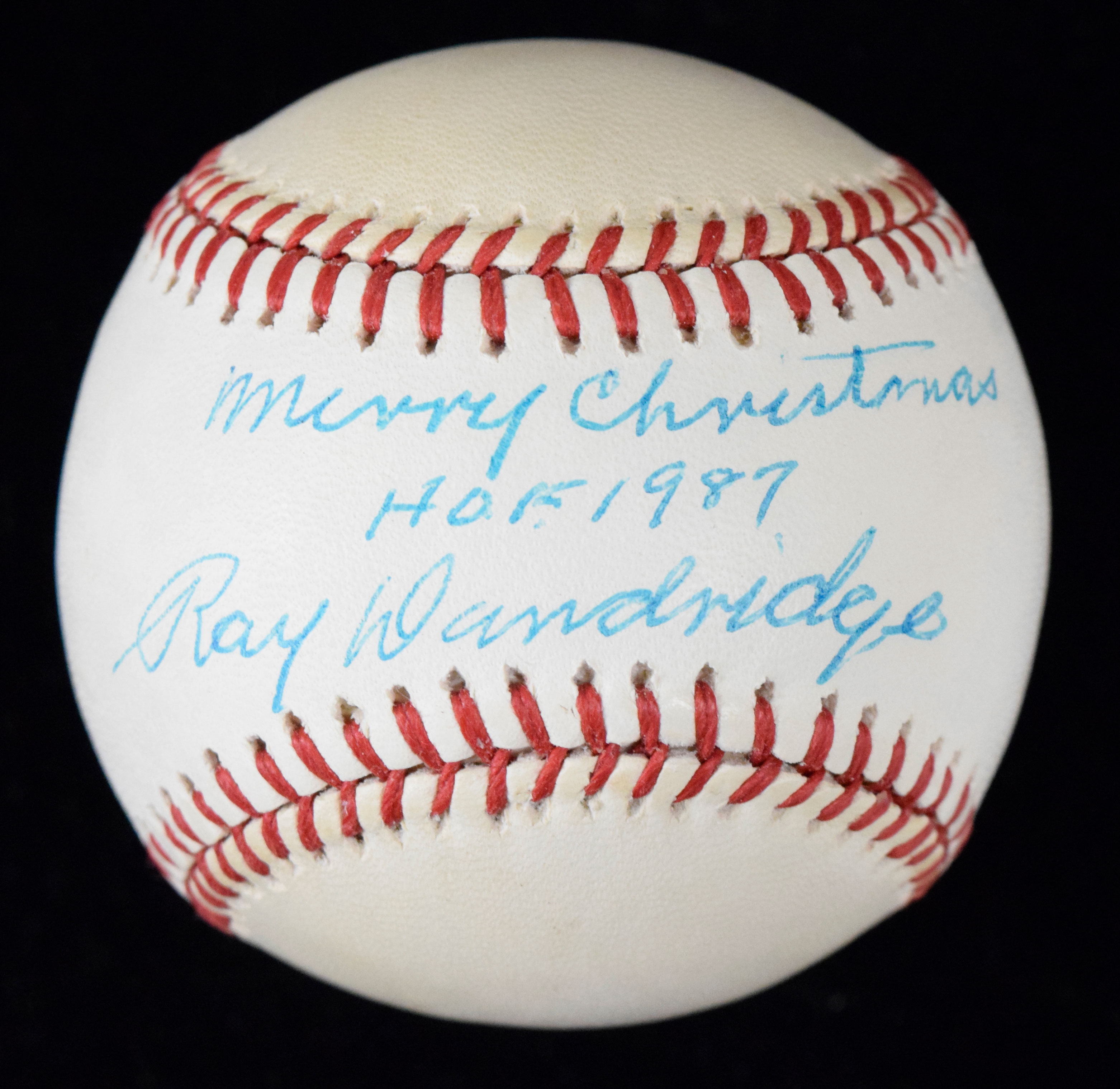 Description:Ray Dandridge signed "Merry Christmas" baseball (EX). B.Brown AL ball signed by Dandridge in blue ink with "Merry Christmas" "HOF 1987" inscriptions. Signature rates 8/9 out of 10. Toning mainly on two of the side panels: EX MERRY CHRISTMAS