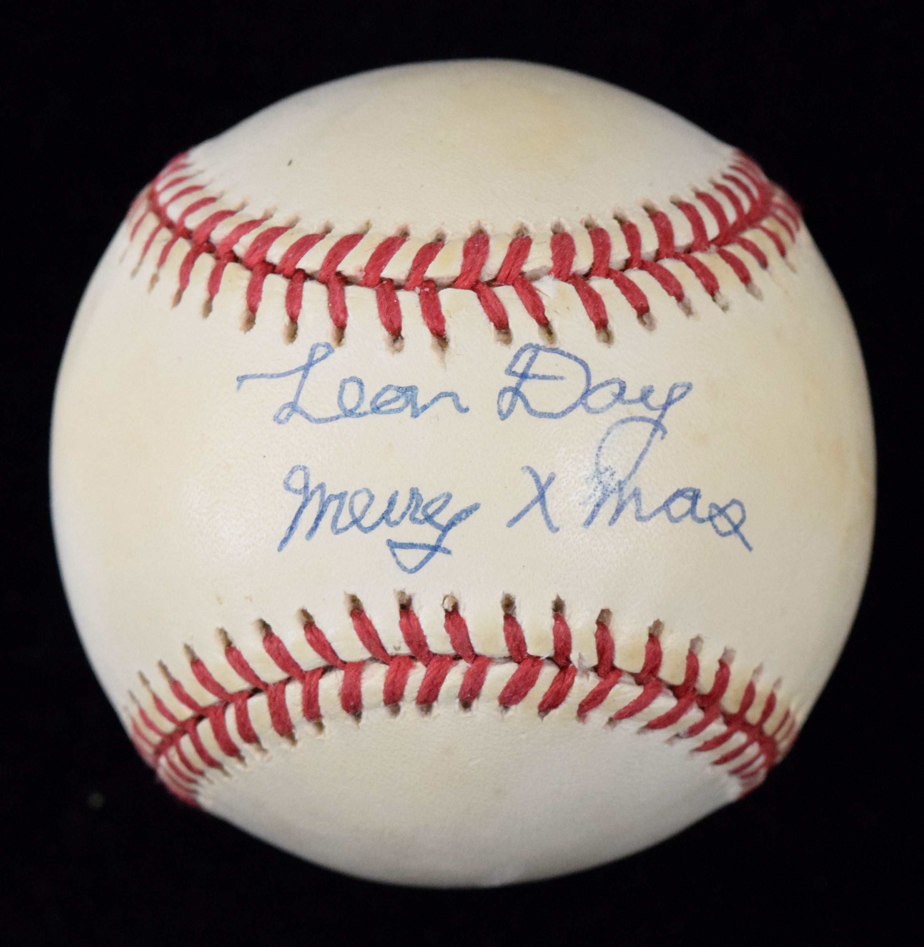 Description:Leon Day signed "Merry Xmas" baseball (EX). W.White NL ball signed by Day in blue ink with "Merry Xmas" inscription. Signature rates 8/9 out of 10. Light to moderate toning on each panel: EX MERRY CHRISTMAS