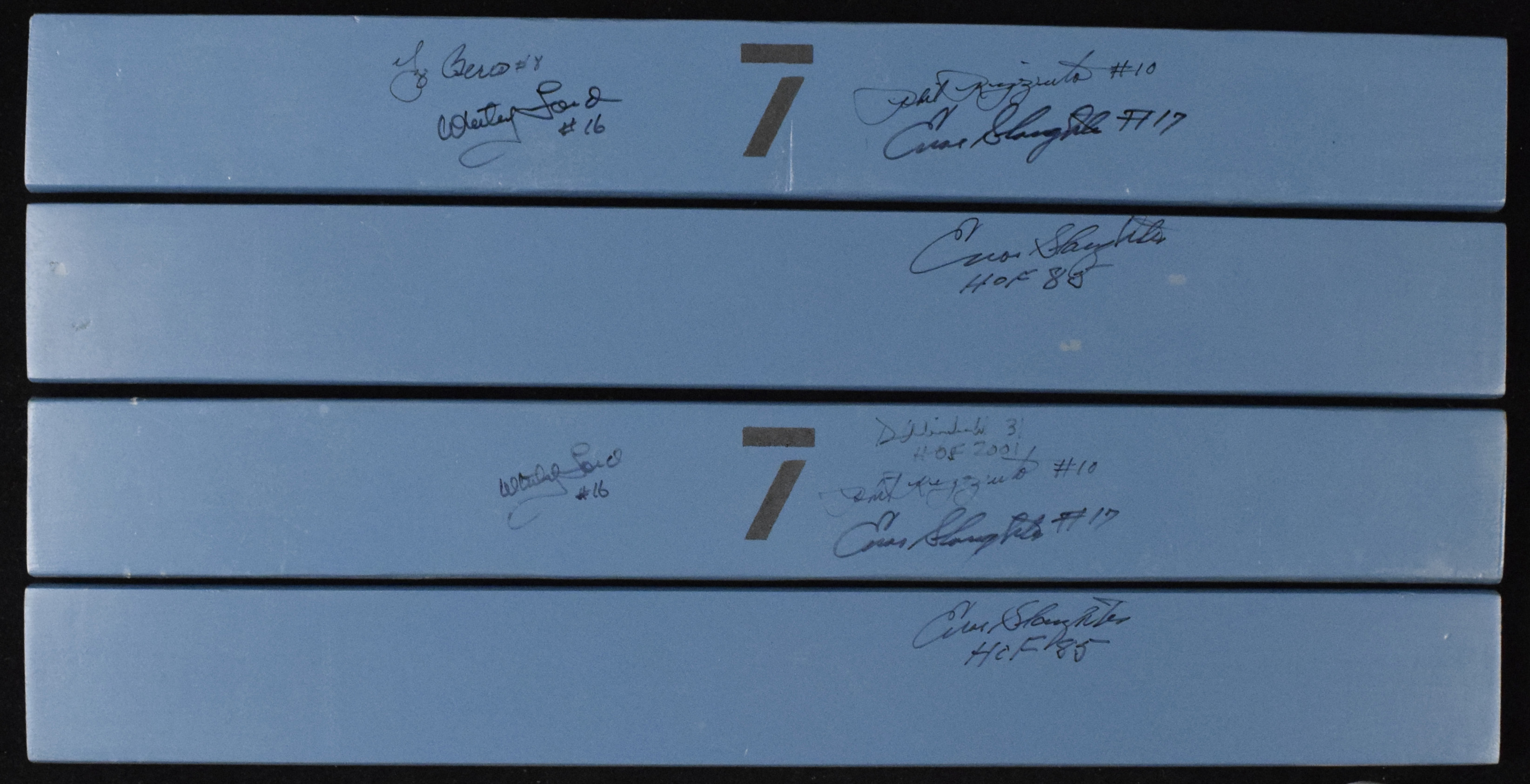 Description:Lot of (4) New York Yankees HOFers signed seat slats (EX/MT-NM). Includes (2) signed by Enos Slaughter with "HOF 85" inscription added to both; One multi-signed by Yogi Berra, Phil Rizzuto, Enos Slaughter, and Whitey Ford; and one multi-signed by Phil Rizzuto, Enos Slaughter, Whitey Ford, and Dave Winfield. Signatures rate 6/7 (Winfield) to 9 (avg 7) out of 10: EX/MT-NM