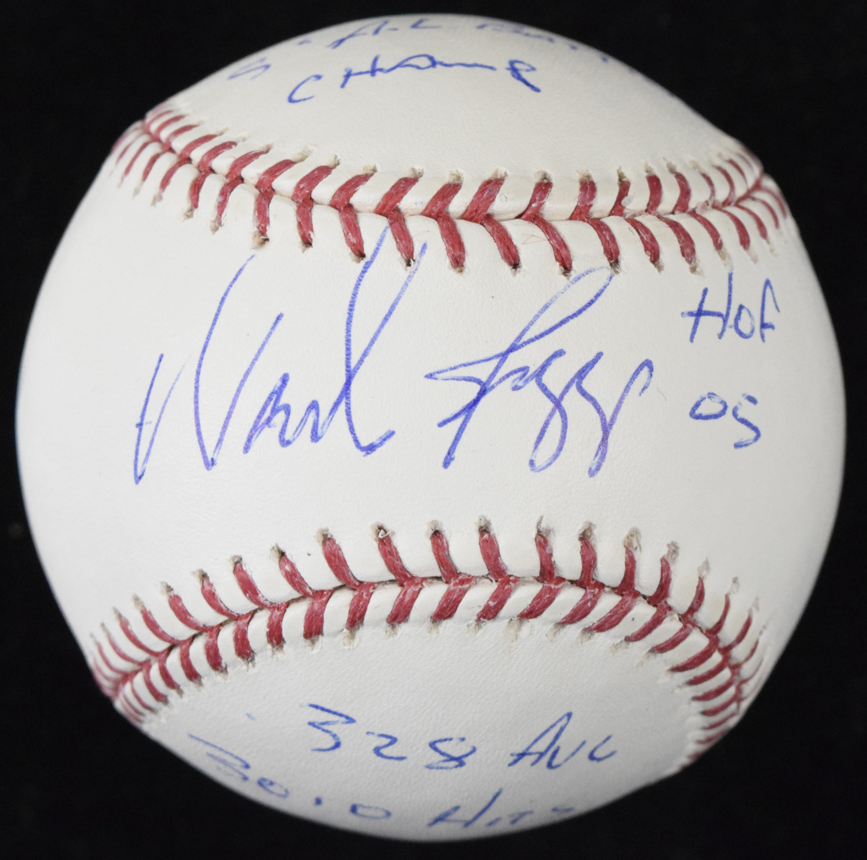 Description:Wade Boggs signed and multi-inscribed baseball - JSA (NM). B.Selig ML ball signed by Boggs in blue ink with "12X All-Star" "5X AL Batting Champ" ".328 Avg" "3010 Hits" "HOF 05" inscriptions. Signature rates 8 out of 10. JSA serial #ed sticker is on the ball: NM