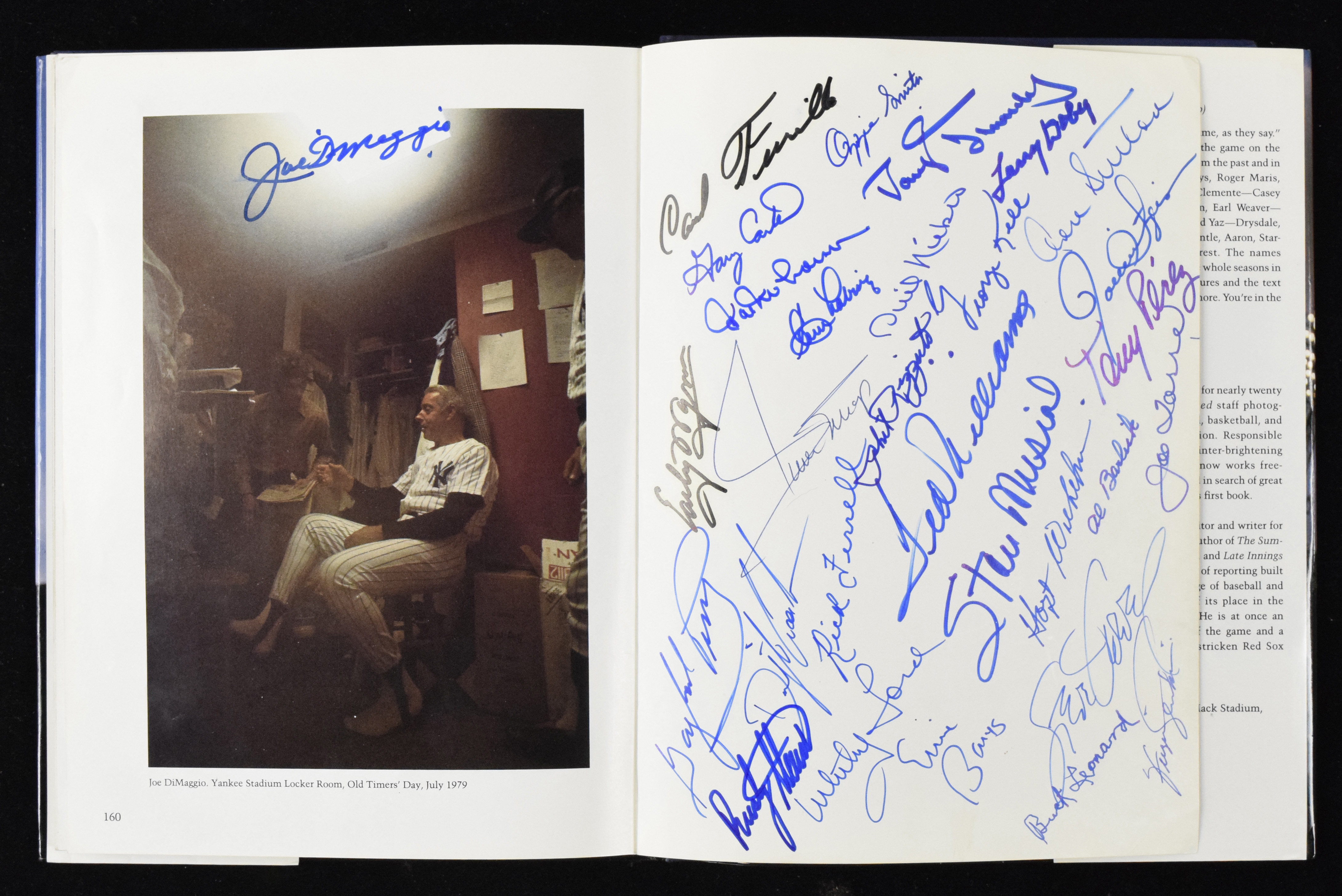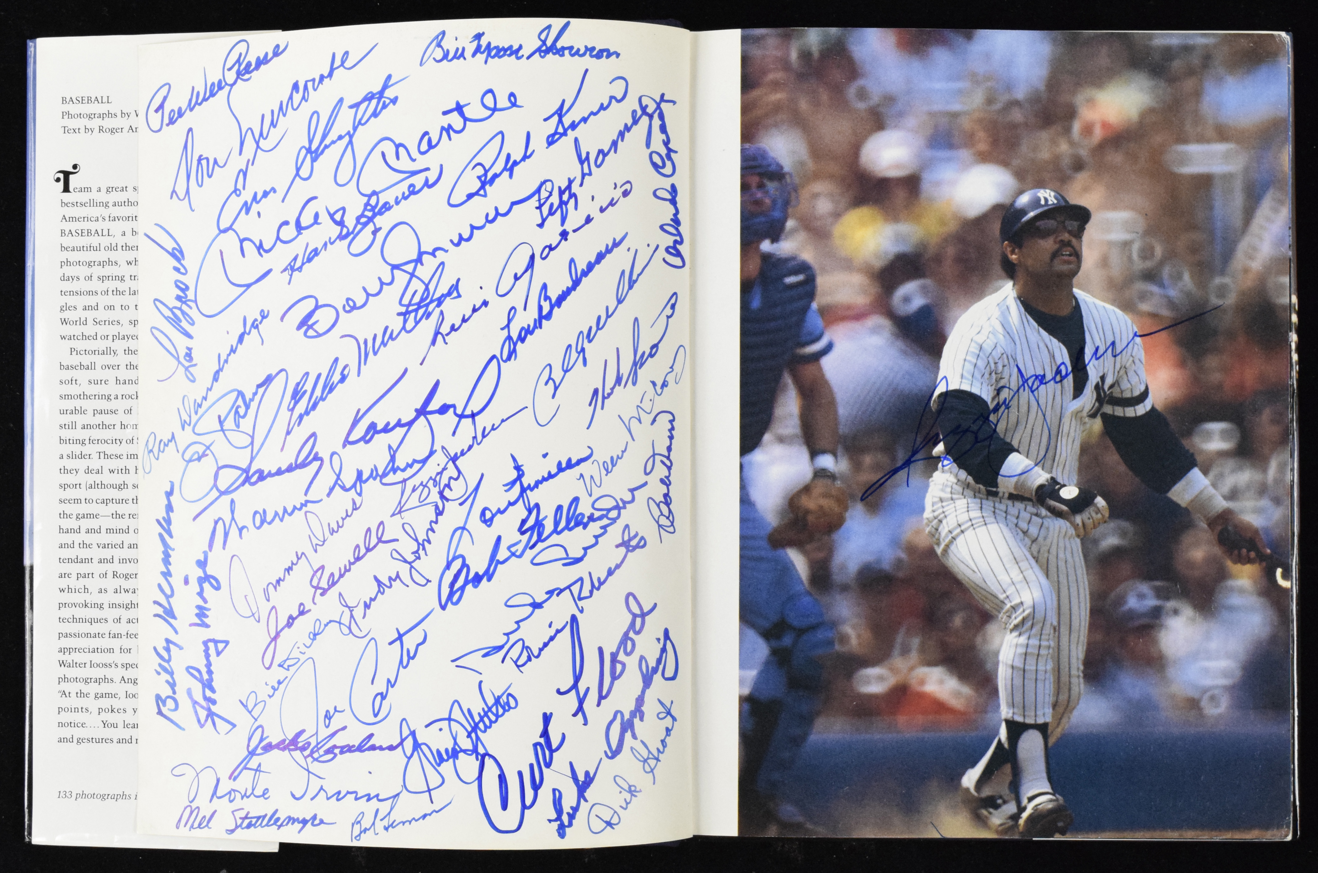 Description:"Baseball" coffee table book with (139) autographs including (75+) Hall of Famers - Mantle (twice), Williams, and DiMaggio (PSA LOA) (EX-NM) Hardcover book featuring the photography of Walter Iooss has (139) autographs throughout including over (75) Hall of Famers, some of which have signed more than once. Many signatures appear on a pair of blank pages (at front and back of book) while others are on individual player pictures. Notables include Mickey Mantle (twice), Ted Williams, Joe DiMaggio, Hank Aaron, Willie Mays (three times), Sandy Koufax (three times), Bill Dickey, Tom Seaver, Pee Wee Reese, Don Drysdale, Lefty Gomez, Reggie Jackson (four times), Willie McCovey, Bob Feller, Yogi Berra (rwice), Johnny Bench (three times), Carl Yastrzemski (twice), Willie Stargell (twice), Steve Carlton, Carlton Fisk, Nolan Ryan, Rod Carew, Gary Carter, Larry Doby, Whitey Ford, Stan Musial, Ernie Banks, Carl Furillo, Tug McGraw, Pete Rose, Curt Flood, Steve Garvey, and others. A more complete list can be found in the PSA online database under certification number (U06444). Marker signatures rate 8 out of 10 or better and there is some mild general handling wear. Includes full LOA from PSA/DNA: EX-NM ($2,000-$3,000)