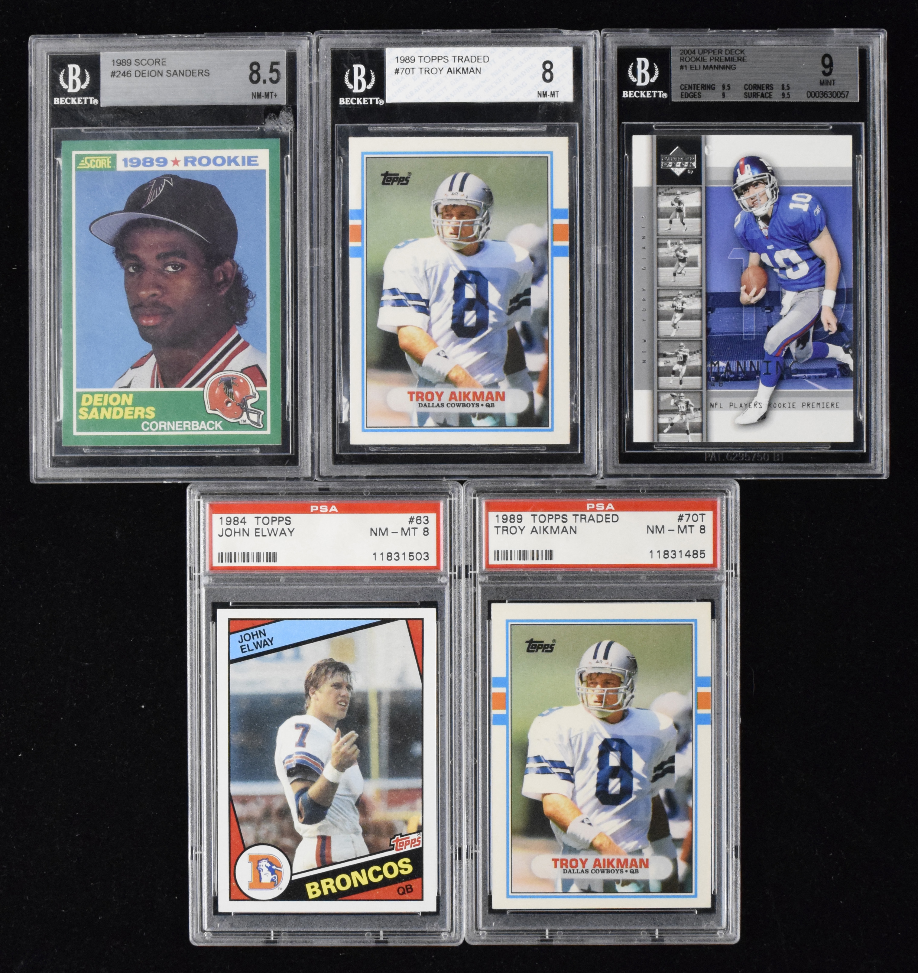 Lot of (5) football stars and HOFers graded rookie cards (NM/MT-MT). Includes 1984 Topps #63 John Elway (PSA 8 NM/MT), (2) 1989 Topps Traded #70T Troy Aikman (Beckett 8 NM/MT and PSA 8 NM/MT), 1989 Score #246 Deion Sanders (Beckett 8.5 NM/MT+), and 2004 Upper Deck Rookie Premiere #1 Eli Manning (Beckett 9 MT).