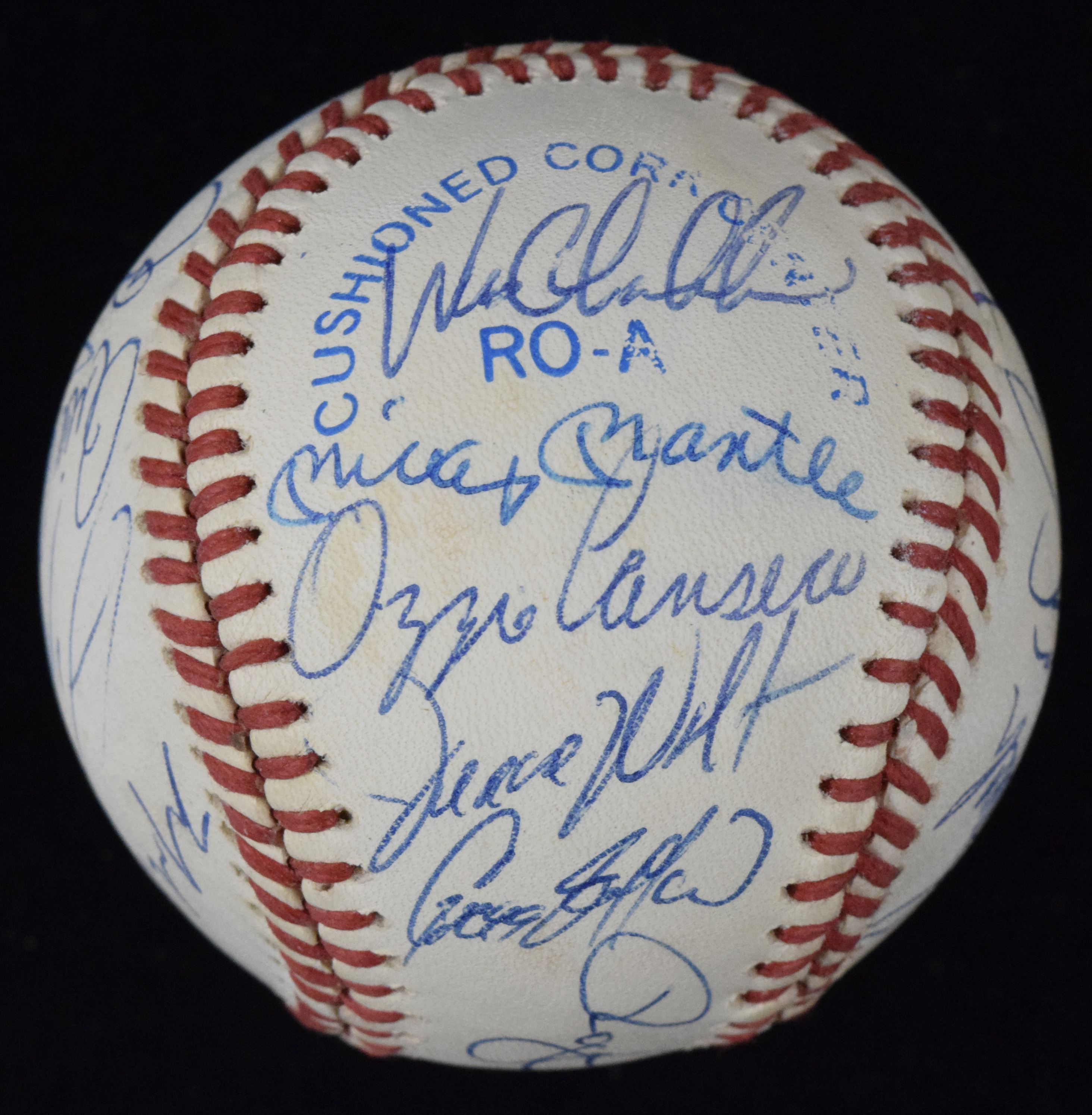 Description:Multi-signed baseball with Mantle and other HOFers (EX). B.Brown AL ball signed by (21) including Mickey Mantle, Richie Ashburn, Ernie Banks, Steve Carlton, Jim Palmer, Johnny Bench, Roger Clemens, Pete Rose, Mark Grace, Darryl Strawberry, Lenny Dykstra, Dwight Gooden, Gregg Jefferies, Jerome Walton, Mitch Williams, Kevin Maas, Ozzie Canseco, and others. Signatures rate 6/7 (Gooden) to 9/10 (avg 8) out of 10. Scattered spots of toning: EX