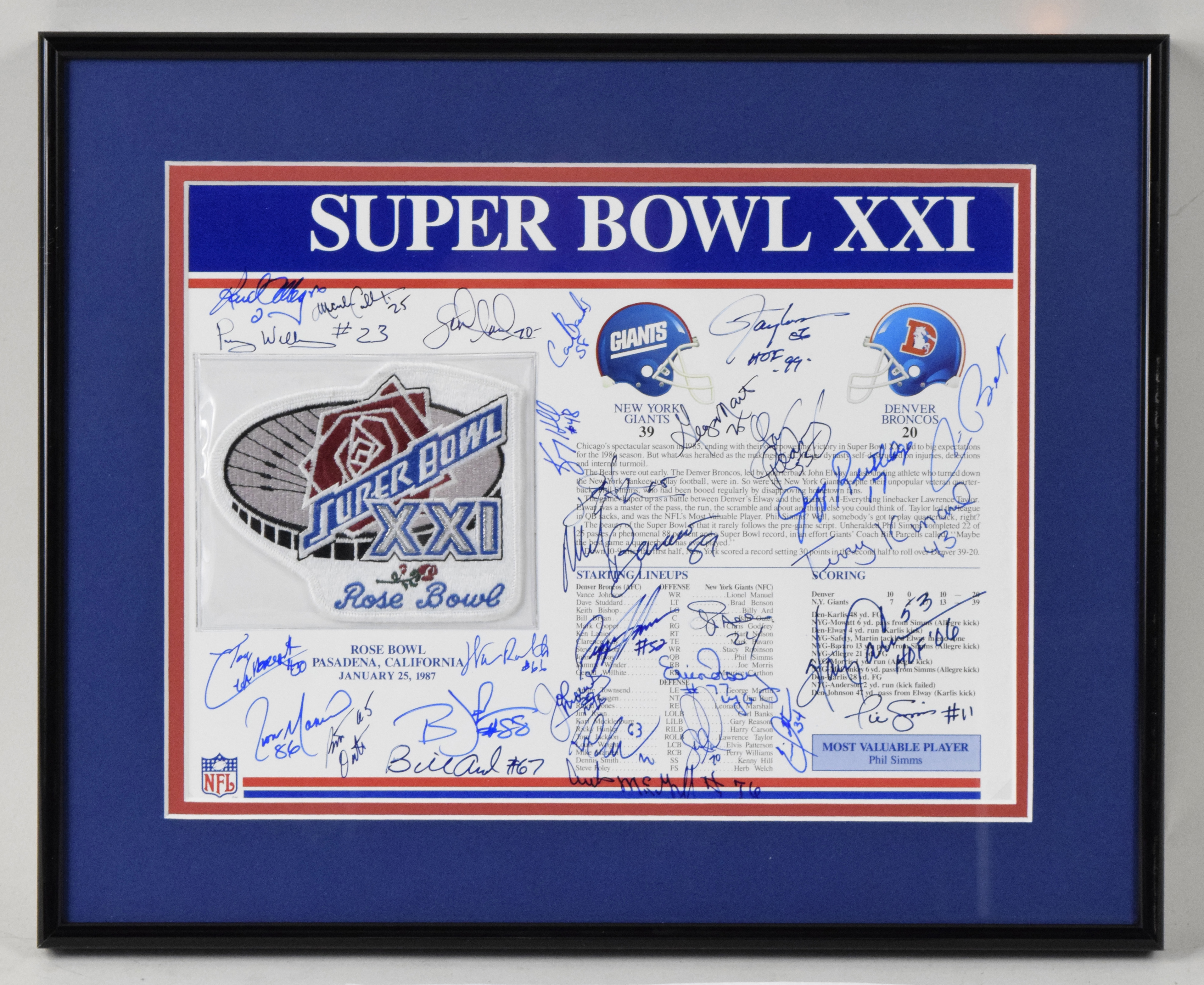 Description:Super Bowl XXI champion New York Giants team signed framed display piece (NM). Approx. 13"x16" framed Super Bowl patch display signed by (30) including Lawrence Taylor with "HOF 99" inscription, Harry Carson with "HOF 06" inscription, Phil Simms, Leonard Marshall, Joe Morris, Mark Bavaro, Jim Burt, George Martin, Bill Ard, Carl Banks, Kenny Hill, Karl Nelson, Bart Oates, Gary Reasons, Perry Williams, Terry Kinard, and others. Signatures rate 7 to 10 (avg 8/9) out of 10. Due to framing, complete condition is unknown: NM appearance