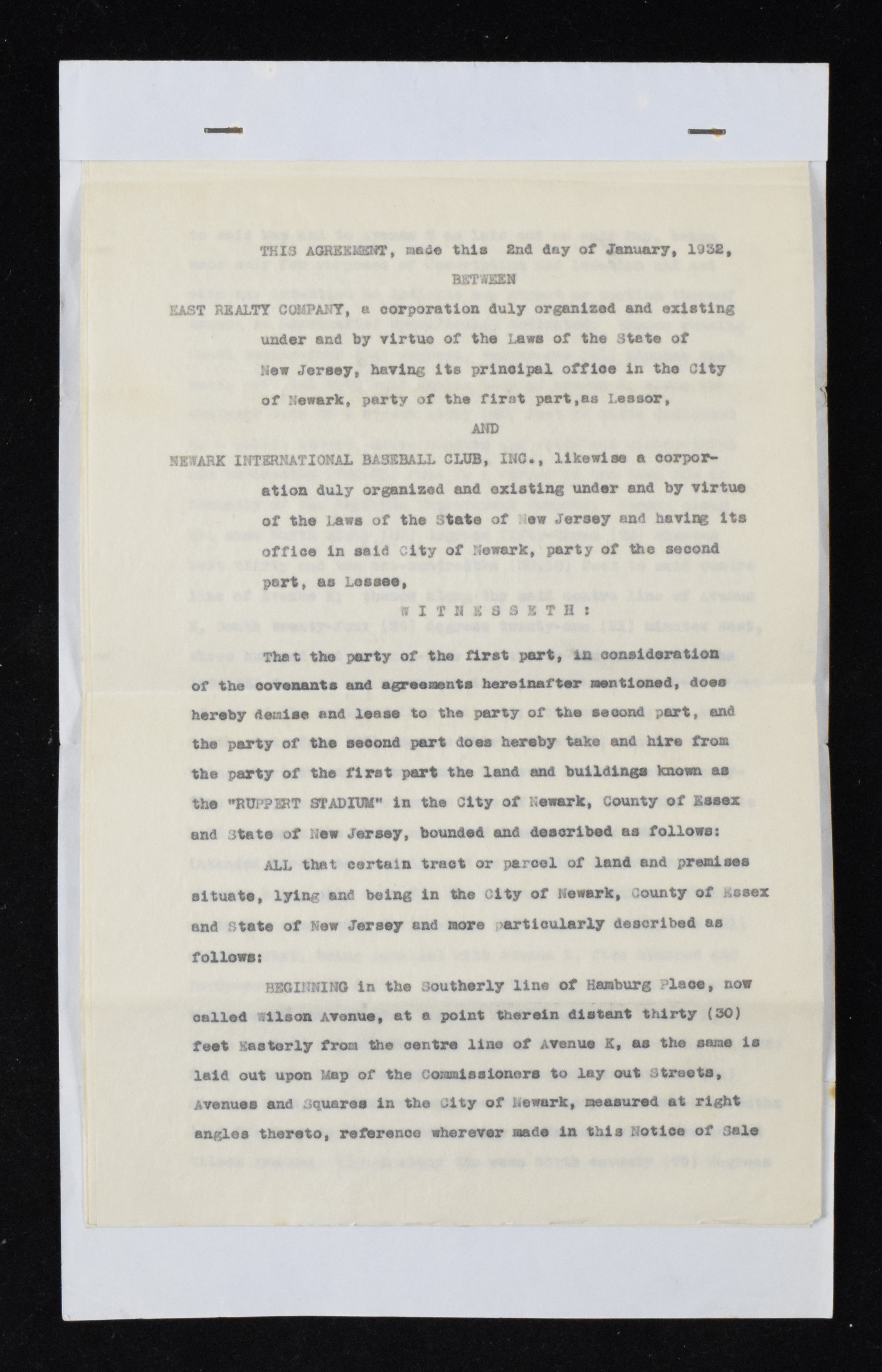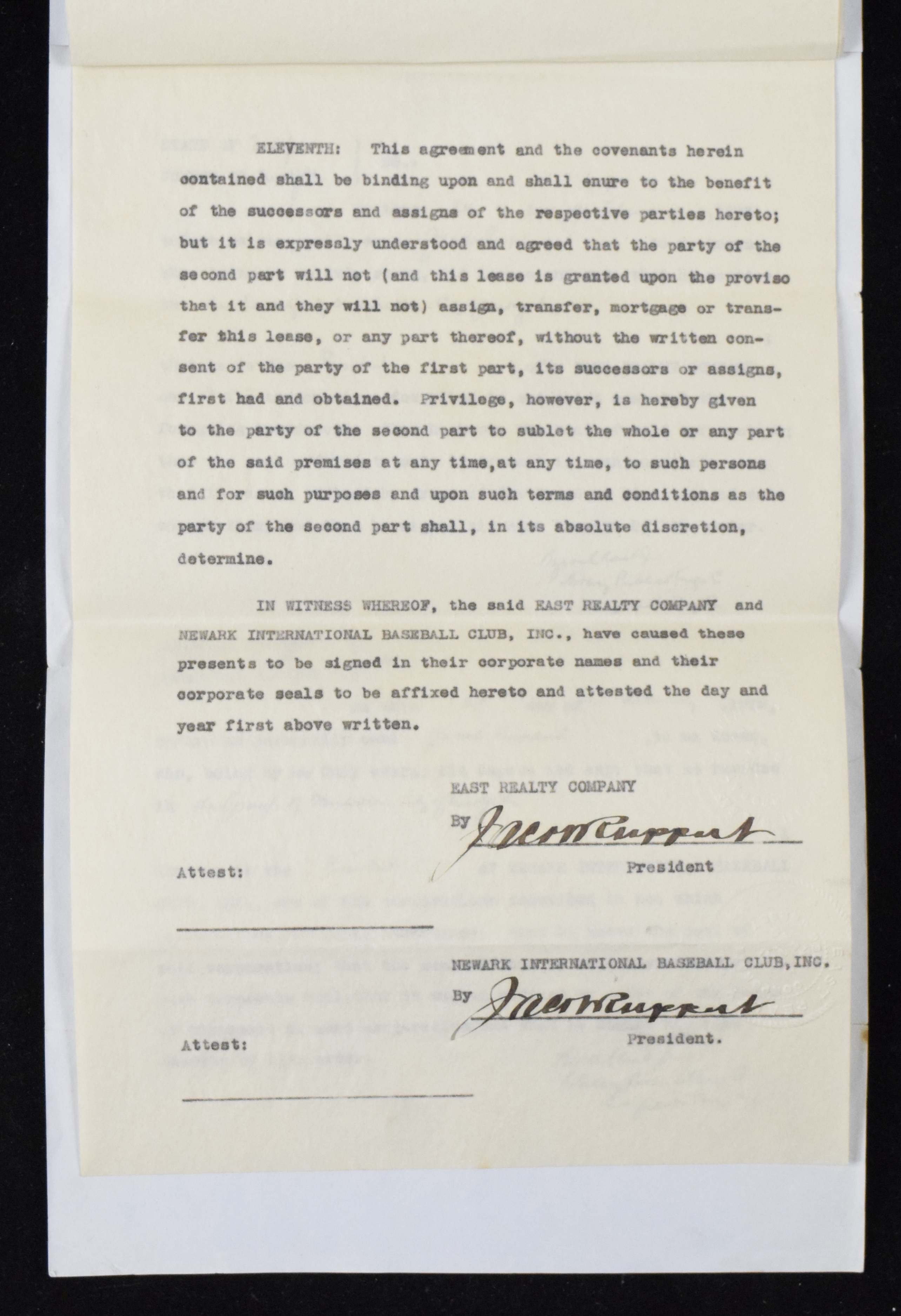 Description:Jacob Ruppert twice signed 1932 Newark Bears stadium lease (Sigs. NM, Document EX)Original multi-page agreement dated February 5, 1932 spelled out terms of an agreement for the Newark Bears to lease the stadium in which they were to play. Signed "Jacob Ruppert" twice on the second to last page in fountain pen rating 9 out of 10. Legal sized pages are stapled into their original heavy paper stock folio and there is some mild handling and storage wear: Sigs. NM, Document EX($400-$600)