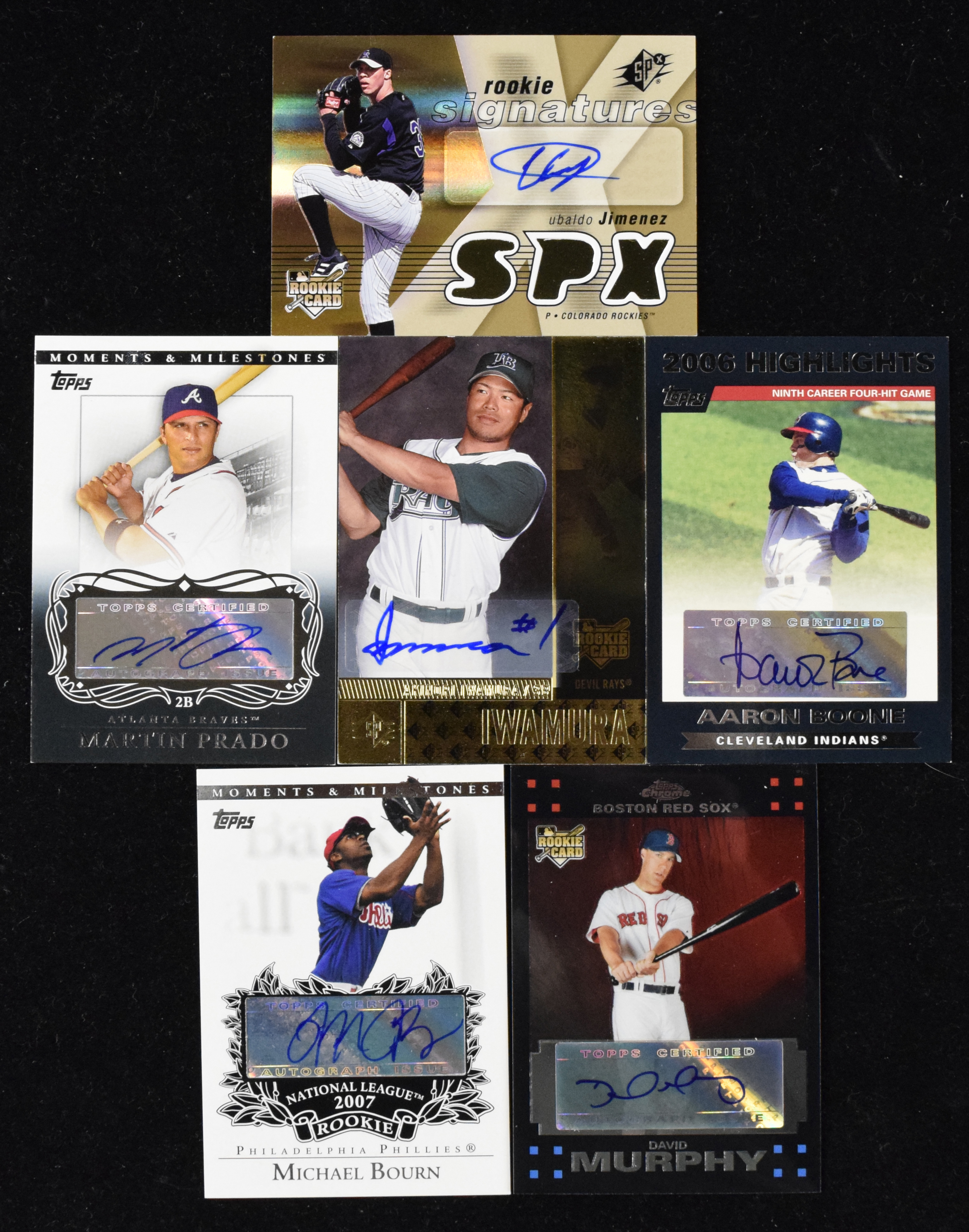 Description:Lot of (100) signed baseball insert cards mostly from 2007 (NM-NM/MT overall).Includes Aaron Boone, Michael Bourn, Carlos Quentin, Jered Weaver, Francisco Cordero, David Murphy, Jon Garland, Brandon Phillips, Russell Martin, Conor Jackson, Martin Prado, Kei Igawa, Ubaldo Jimenez, Damion Easley, Akinori Iwamura, Hong-Chin Kuo, Joel Zumaya, and many others. Signatures rate 7/8 to 10 (avg 9) out of 10: NM-NM/MT overall