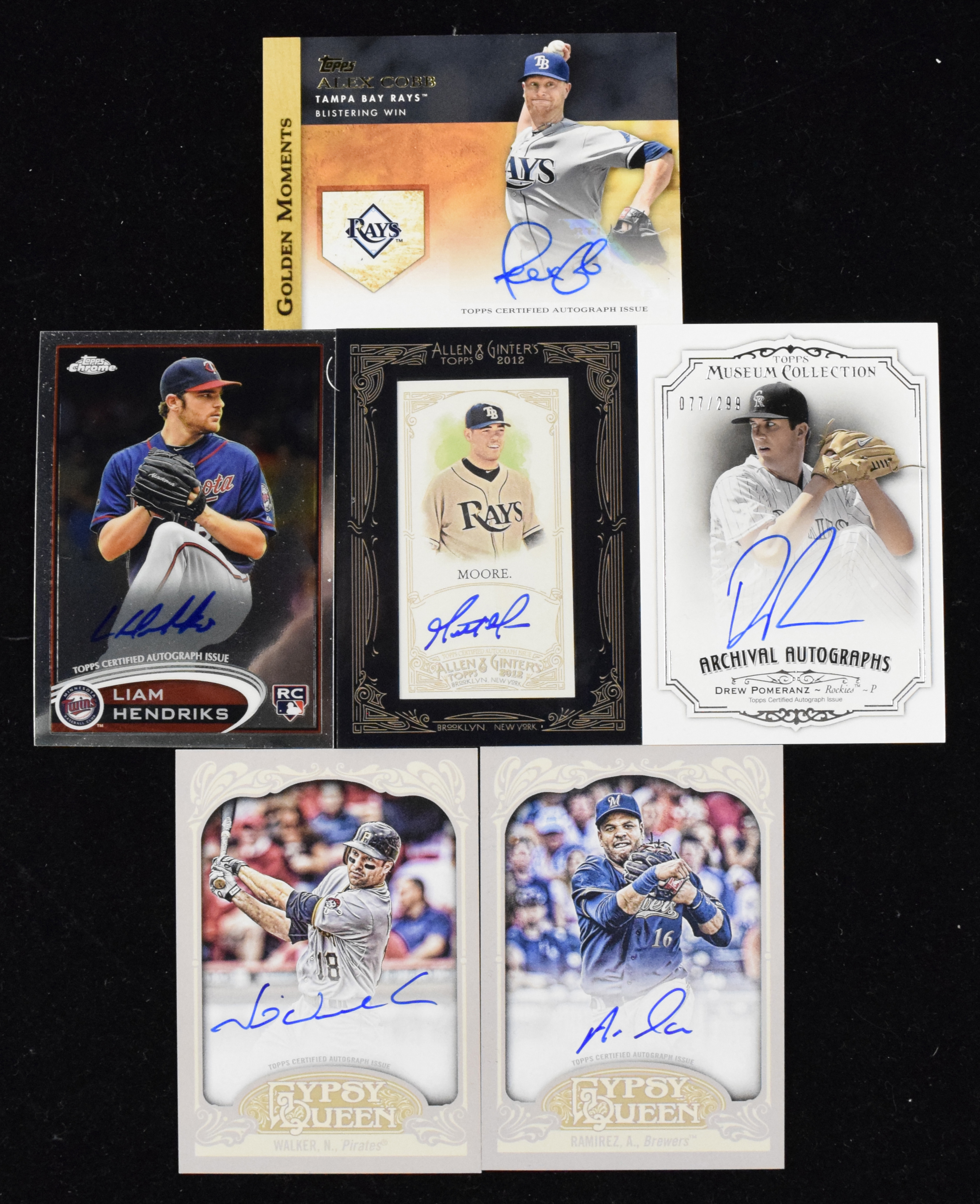 Description:Lot of (100) signed baseball insert cards mostly from 2009-2012 (NM-NM/MT overall).Includes Neil Walker, Liam Hendricks, Trevor Cahill, Aramis Ramirez, Alex Cobb, Gio Gonzalez, Alcides Escobar, Travis Wood, Matt Moore, Drew Pomeranz, Julio Teheran, Elvis Andrus, Joel Hanrahan, Jose Valverde, Yonder Alonso, Alexi Ogando, Jordan Walden, David Murphy, and many others. Signatures rate 7 to 10 (avg 9) out of 10: NM-NM/MT overall