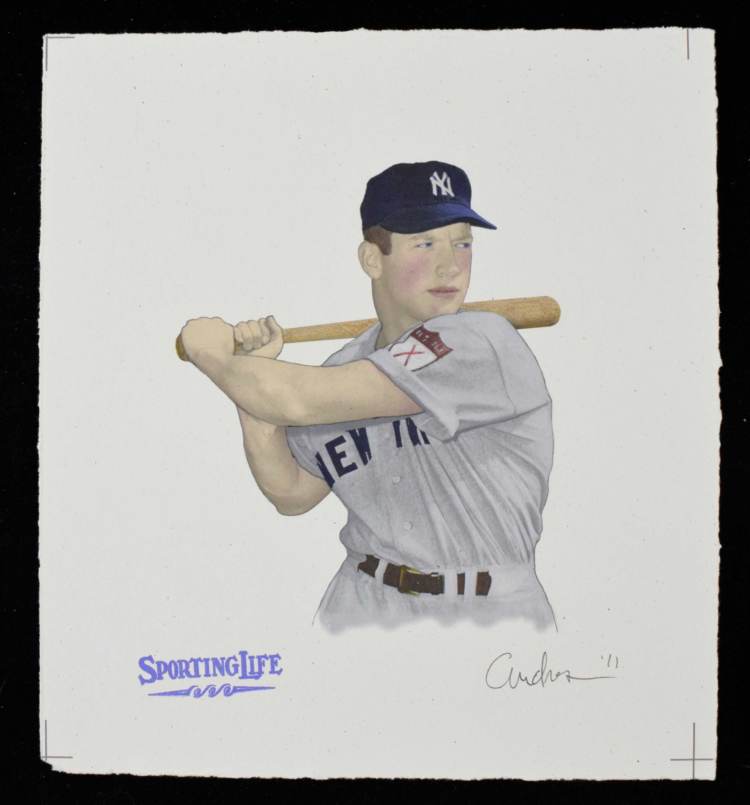 Description:Very nice Mickey Mantle original artwork by Jerrold Andrews (Sporting Life) (EX-NM) Original artwork showing Mickey Mantle during his 1951 Rookie Season is very well done on 10"x11" rag paper. Signed by the artist "Andrews" at lower right and dated 2011. Also bears his "Sporting Life" Company stamp: EX-NM