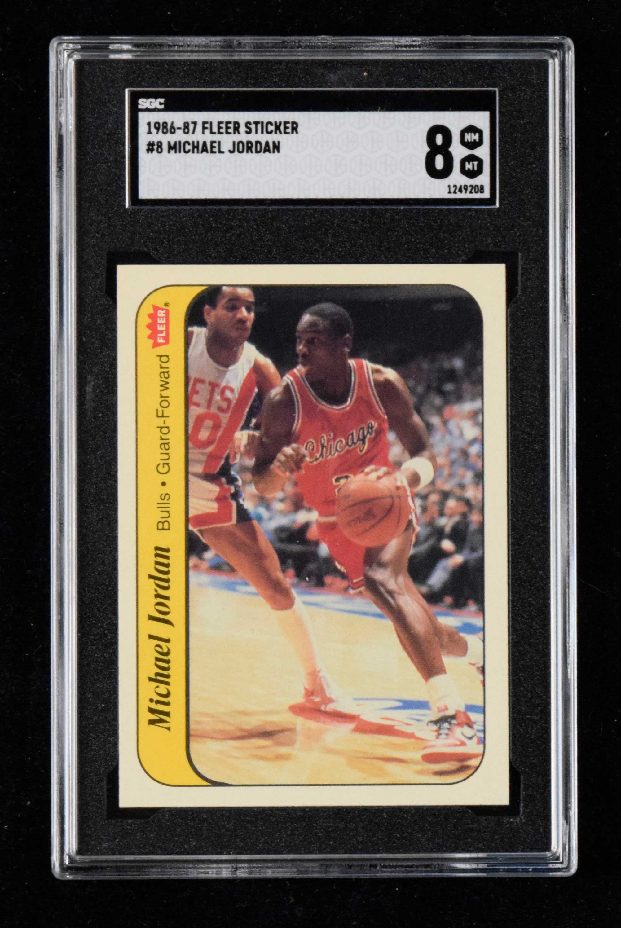 Description:1986 Fleer Stickers #8 Michael Jordan Rookie (SGC 8 NM MT) High grade Rookie year issue is reasonably well centered with little to no mentionable wear: SGC 8 NM MT ($750-$1,000)