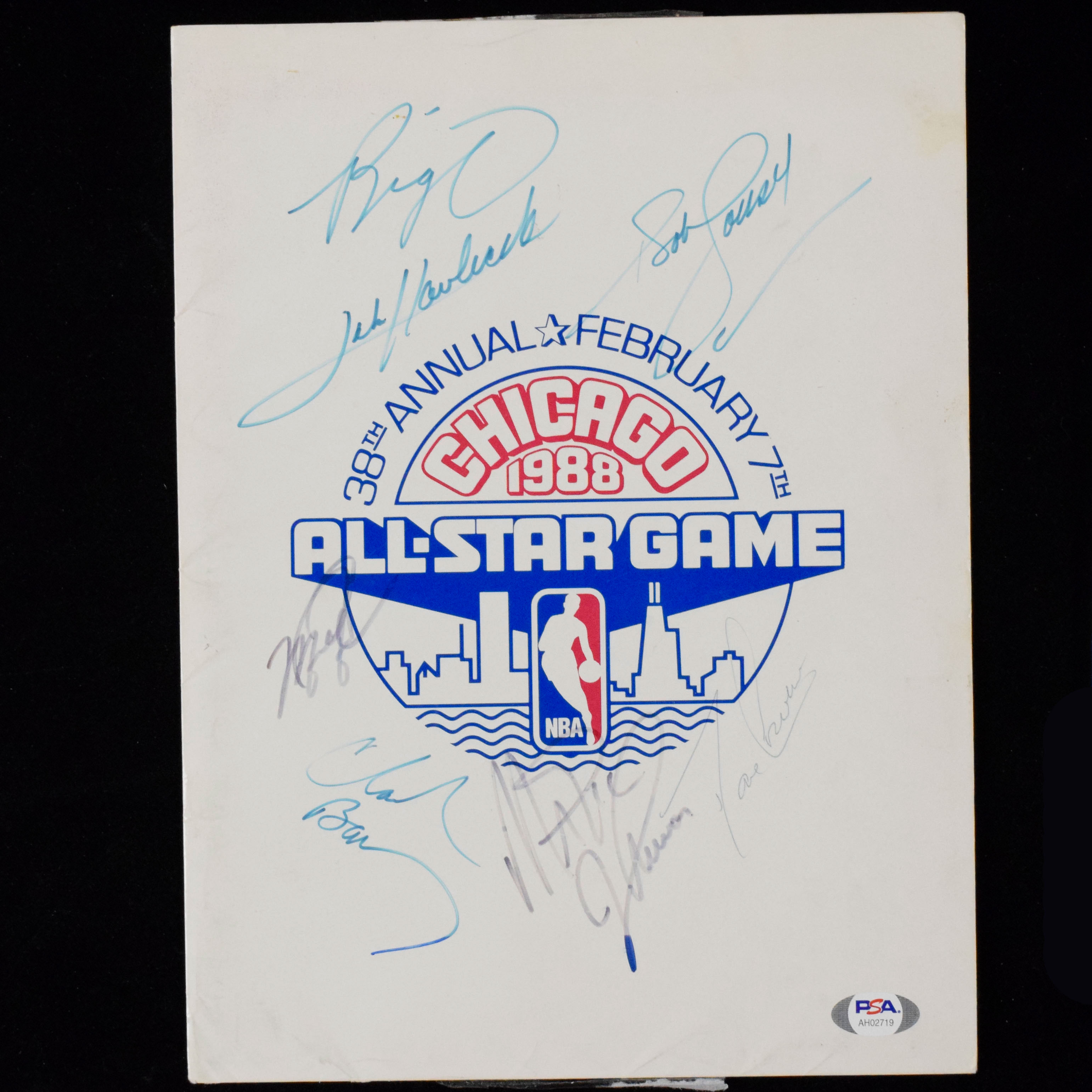 Description:Michael Jordan and (6) other Hall of Famers autographed 1988 NBA All-Star Game folder (full PSA/DNA LOA) (Sigs. EX-EX/MT, Folder GD) Heavy stock glossy folder has the 1988 NBA All-Star Game logo printed on the front. It has been signed by Michael Jordan, Oscar Robertson ("Big O"), John Havlicek, Bob Cousy, Charles Barkley, Magic Johnson, and Dave Cowens. Ink and marker signatures rate 6 to 7/8 out of 10. Mild wear including a few creases/wrinkles to the front cover, back has similar wear and there are small pieces of tape on the top and bottom edges. Includes full LOA from PSA/DNA: Sigs. EX-EX/MT, Folder GD ($750-$1,250)