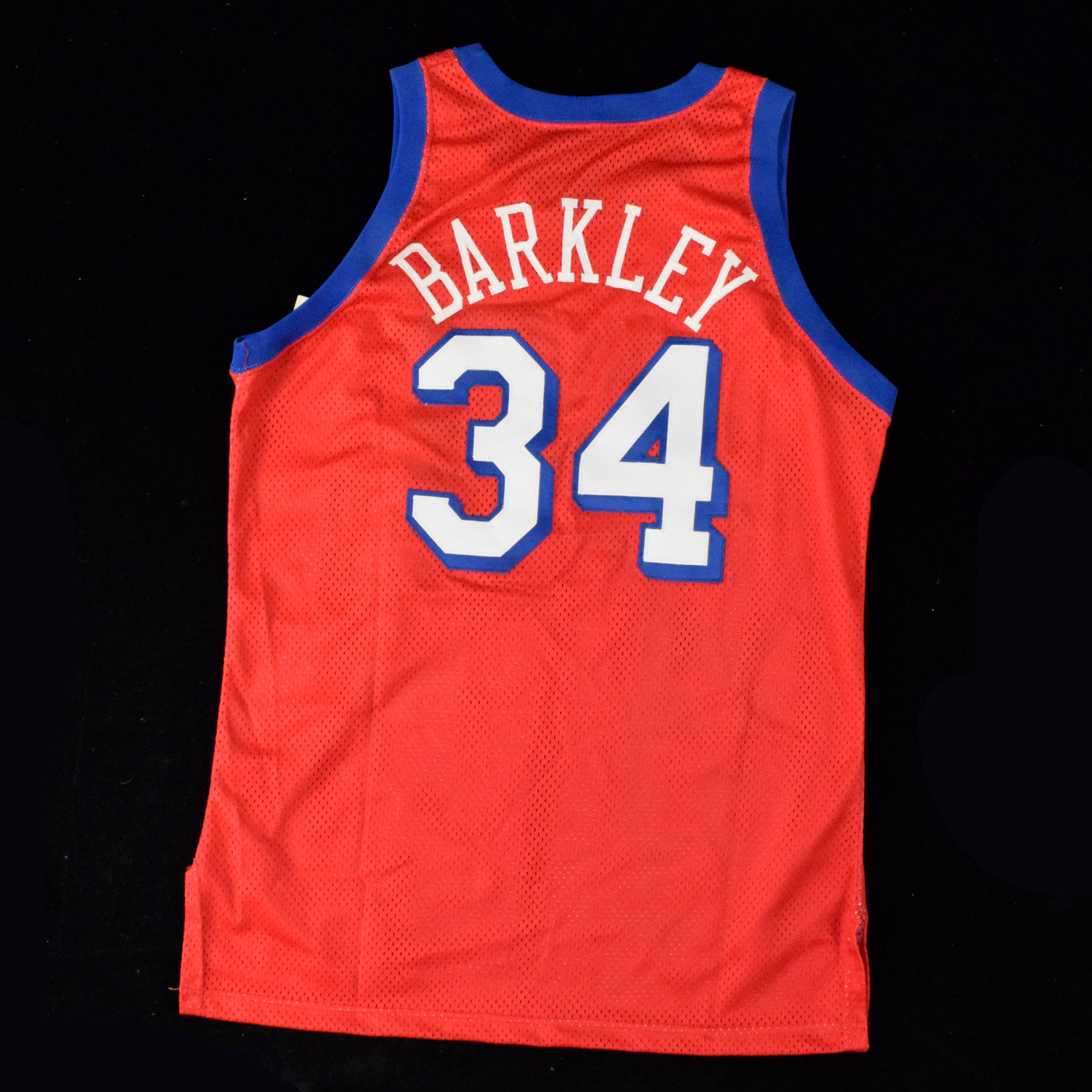 Description:1992-92 Charles Barkley Philadelphia 76ers professional model jersey (EX/MT) Red mesh jersey has a team logo imprinted on the front with number "34" below. Number also appears on back below the name "Barkley." Champion tag on the front tail notes size (48) and is beside a "1991" year tag which also notes "Body Length +2." It it possible that there is a touch of light use/wear. Please note - this jersey is a size (48) which matches some Barkley jerseys from this period while others which have been authenticated and photo matched are slightly larger: EX/MT ($500-$1,000)