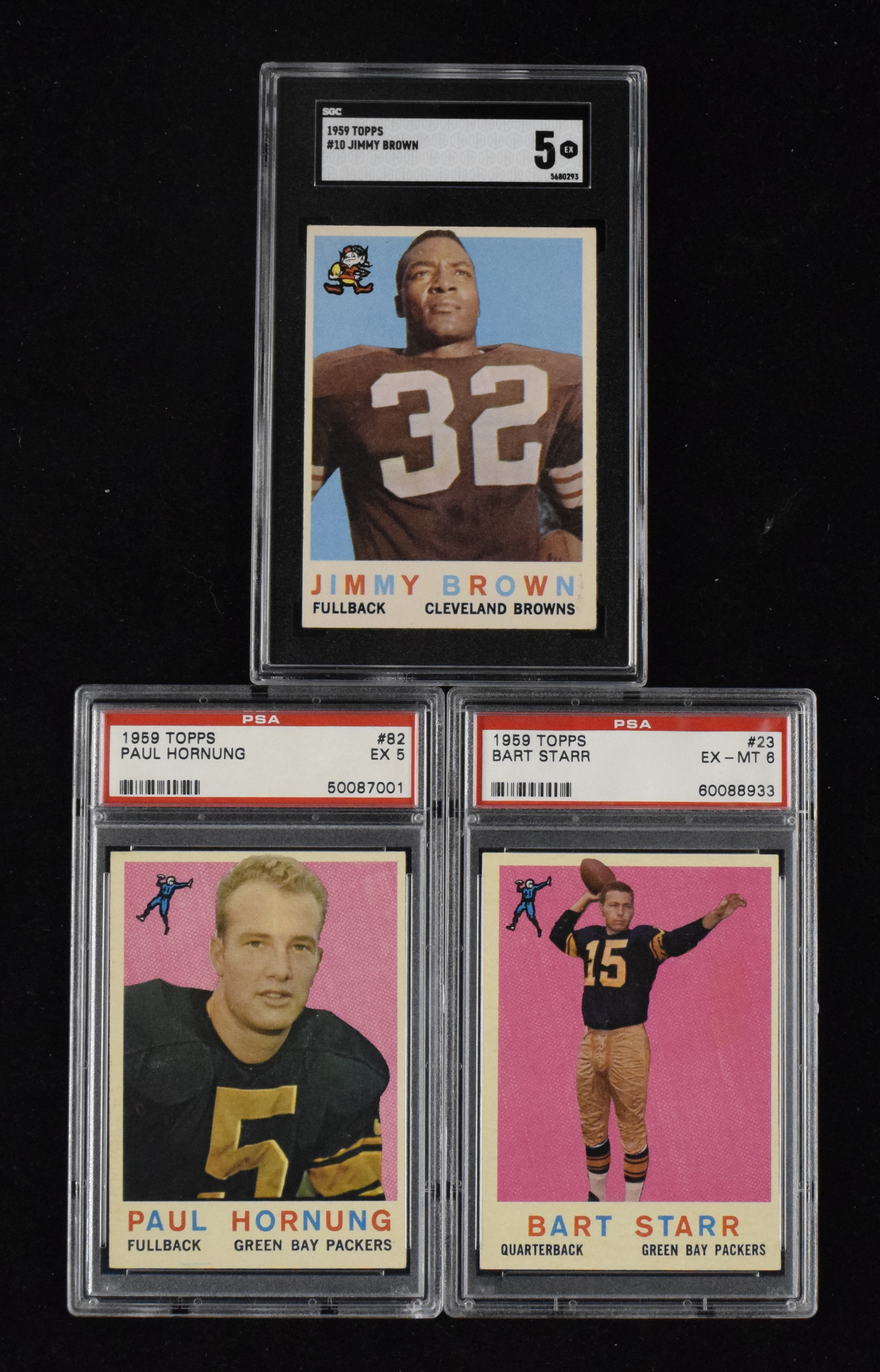 1959 Topps Football complete set (176 cards) - (5) PSA or SGC graded (Avg. VG/EX) Keys: #1 Unitas (GD), 10 Brown (SGC 5 EX), 20 Gifford (VG/EX-EX), 23 Starr (PSA EX-MT 6), 51 Huff (VG), 72 Hazeltine (PSA NM 7), 82 Hornung (PSA EX 5), 103 Karras (2, VG and PSA EX-MT 6), 116 Kramer (EX), 130 Tittle (EX/MT very slightly OC), 140 Mitchell (strong EX), and 155 Taylor (EX-EX/MT): Avg. VG/EX ($400-$600)