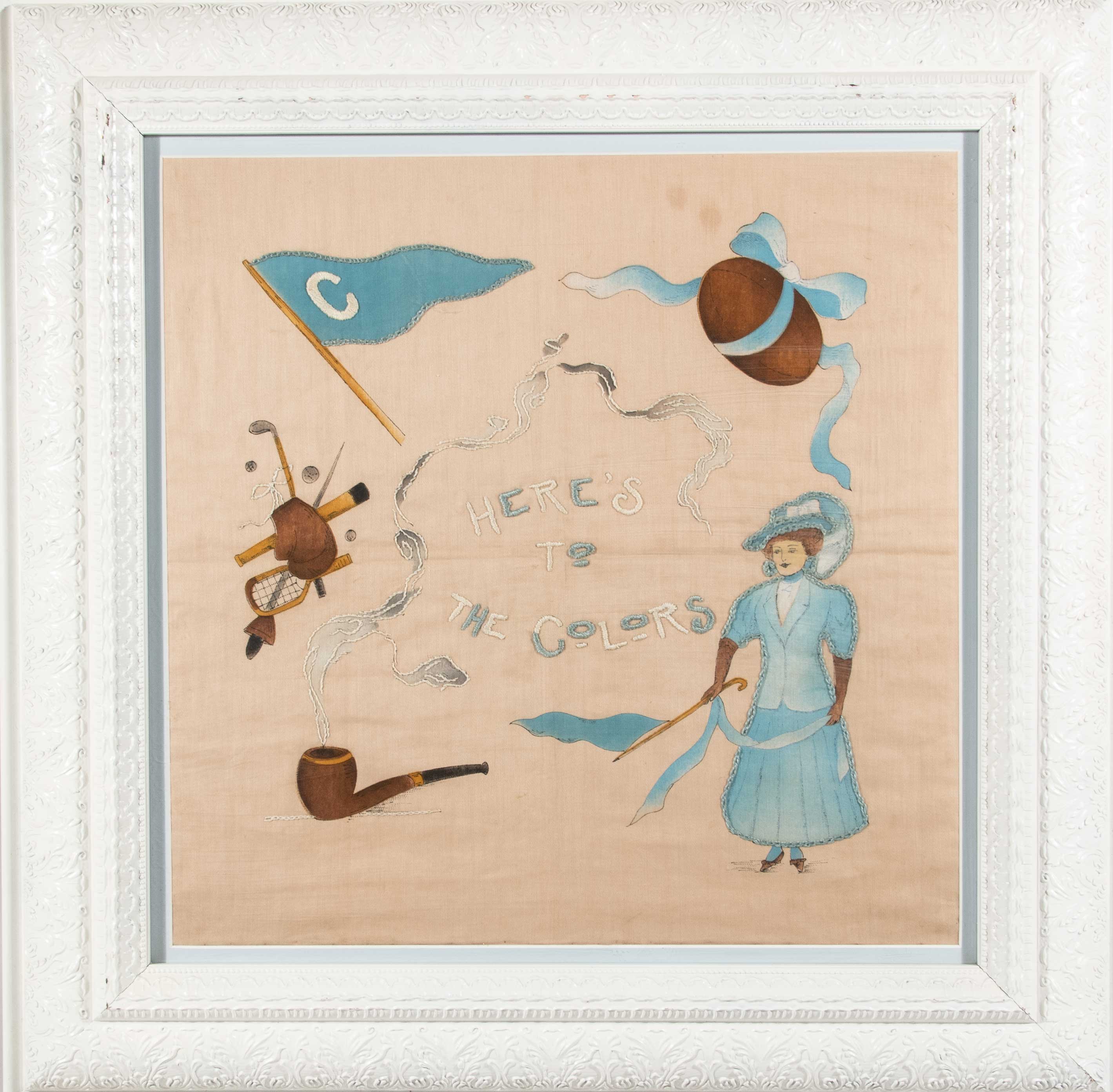 Description:Oversize framed Columbia University sports themed embroidered pillowcase, c.1900s-10s (EX/MT). Frame measures approx. 29"x29". Very nicely constructed piece with hand embroidering and some additional details and illustrations added in paint. It relates to Columbia's sports and depicts various sporting equipment. Due to framing, complete condition is unknown, but shows only minor wear: EX/MT